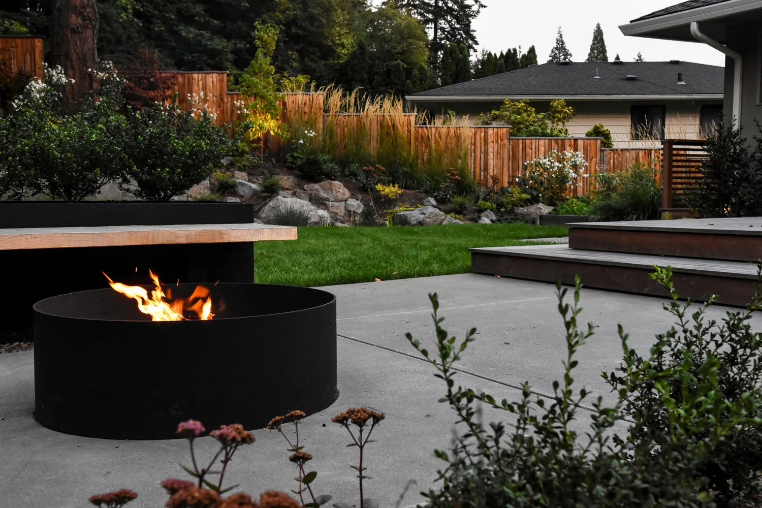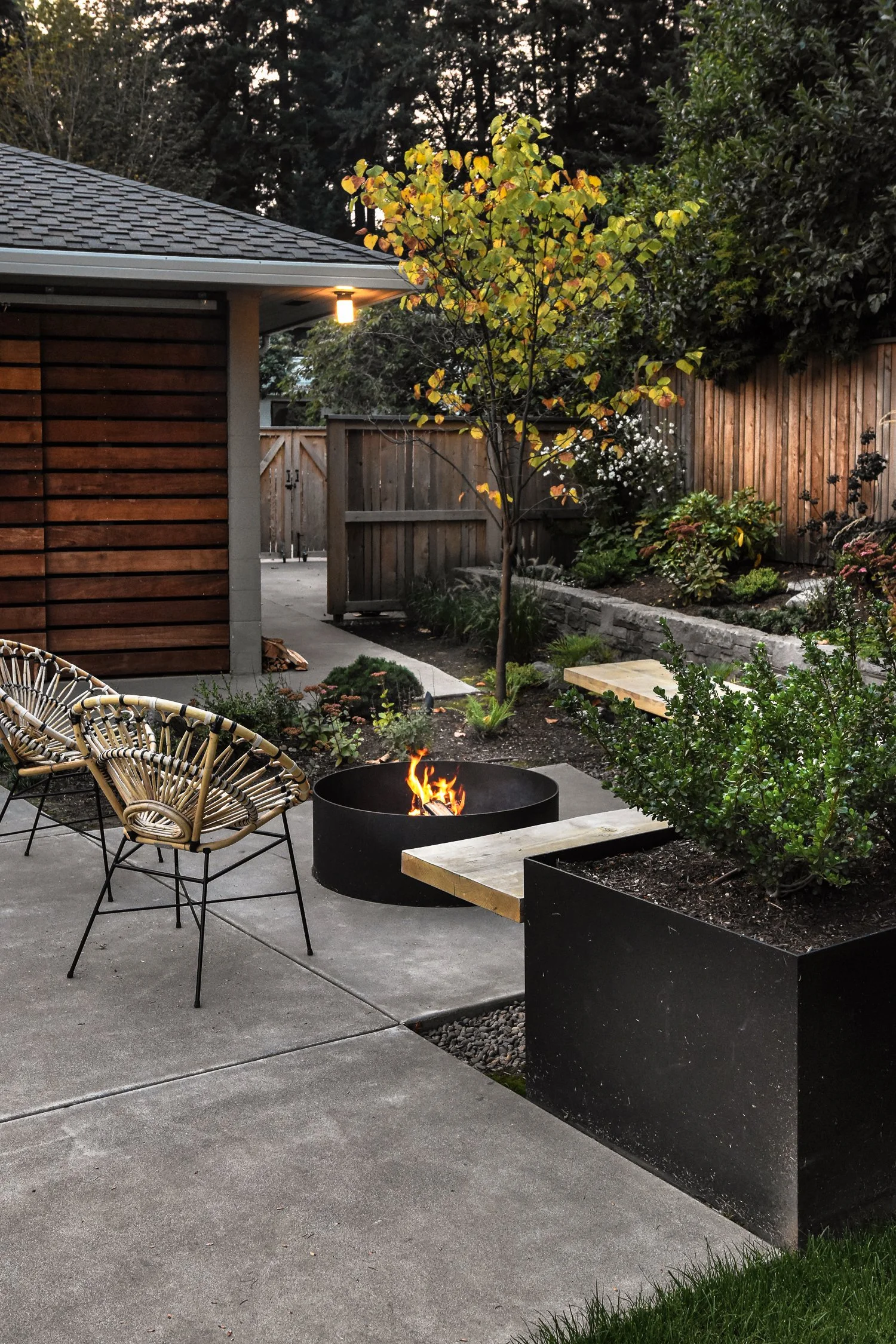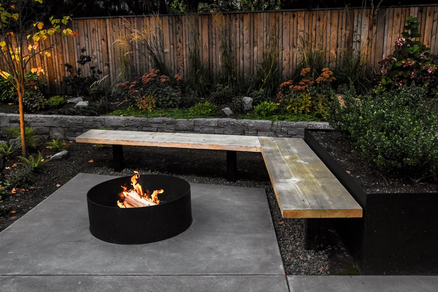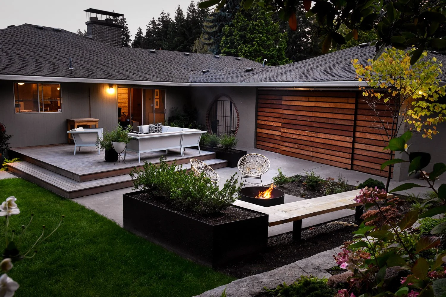 The L-shaped, mid-century modern home opens up to an expansive central courtyard featuring a large Ipe wood deck, a roomy sand-finished concrete patio and a steel, wood-burning fire pit area with a custom cedar slab bench — all flanked by custom steel planters — to create a variety of outdoor garden spaces ready to be enjoyed throughout the spring, summer and fall.