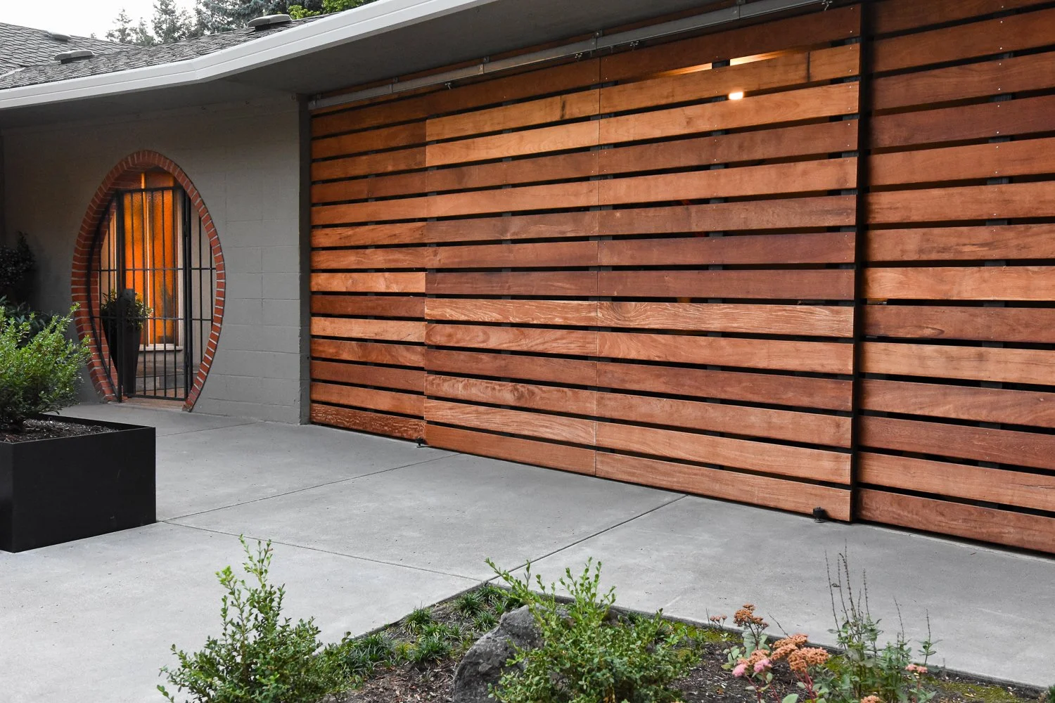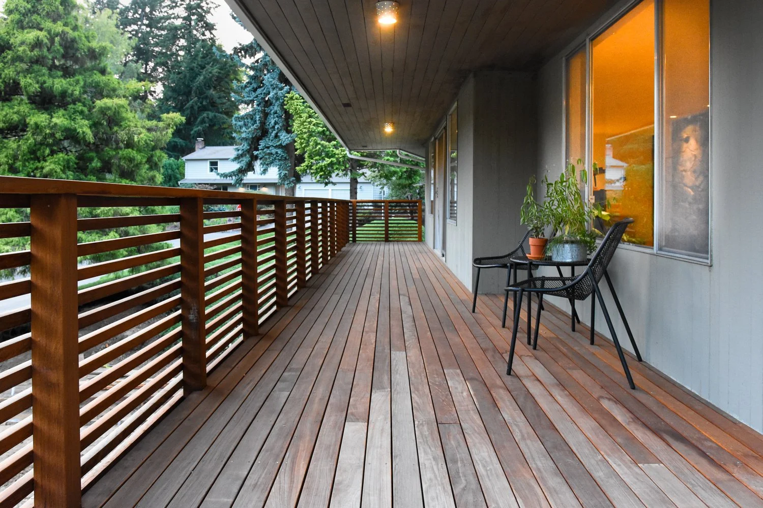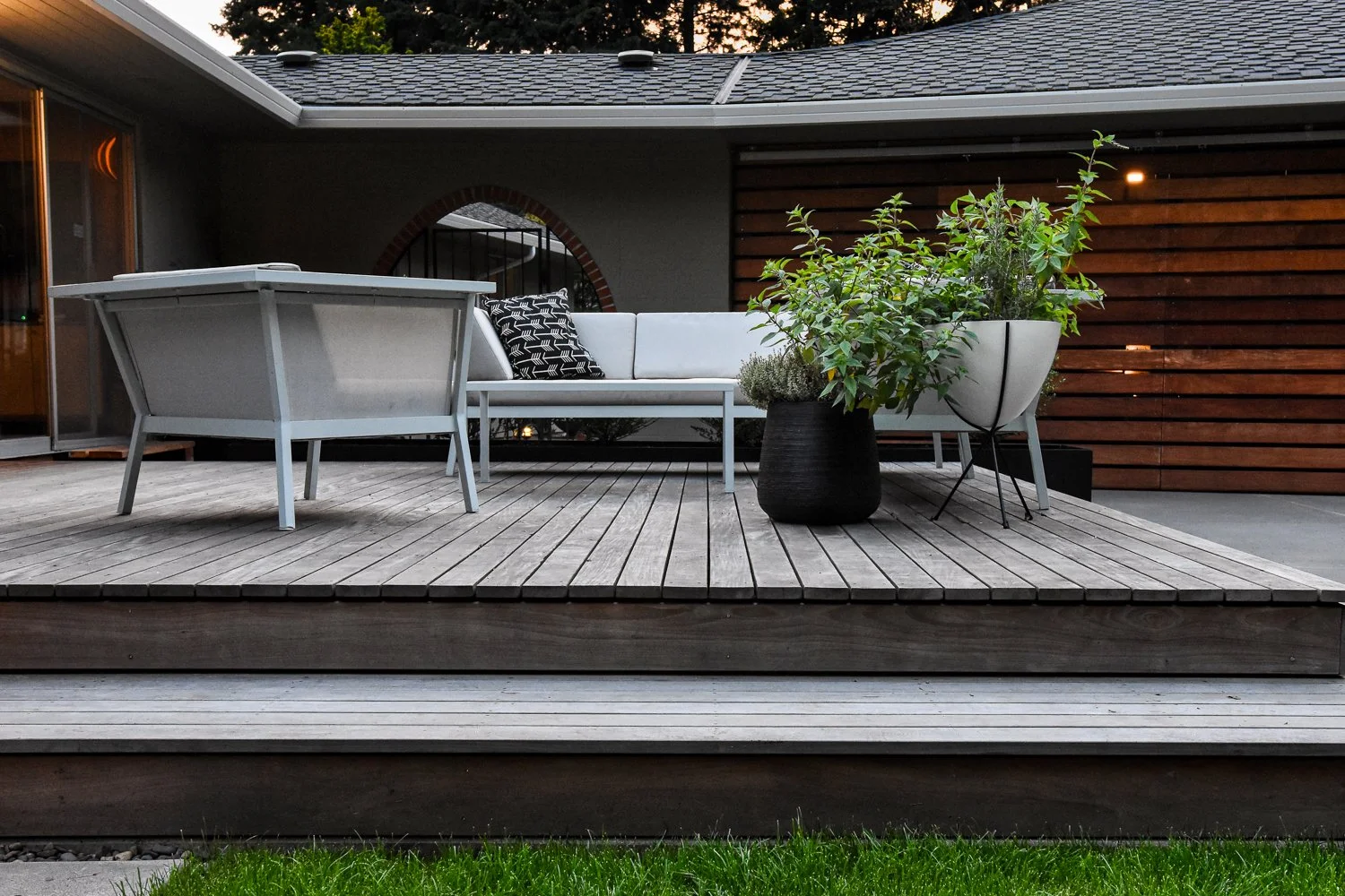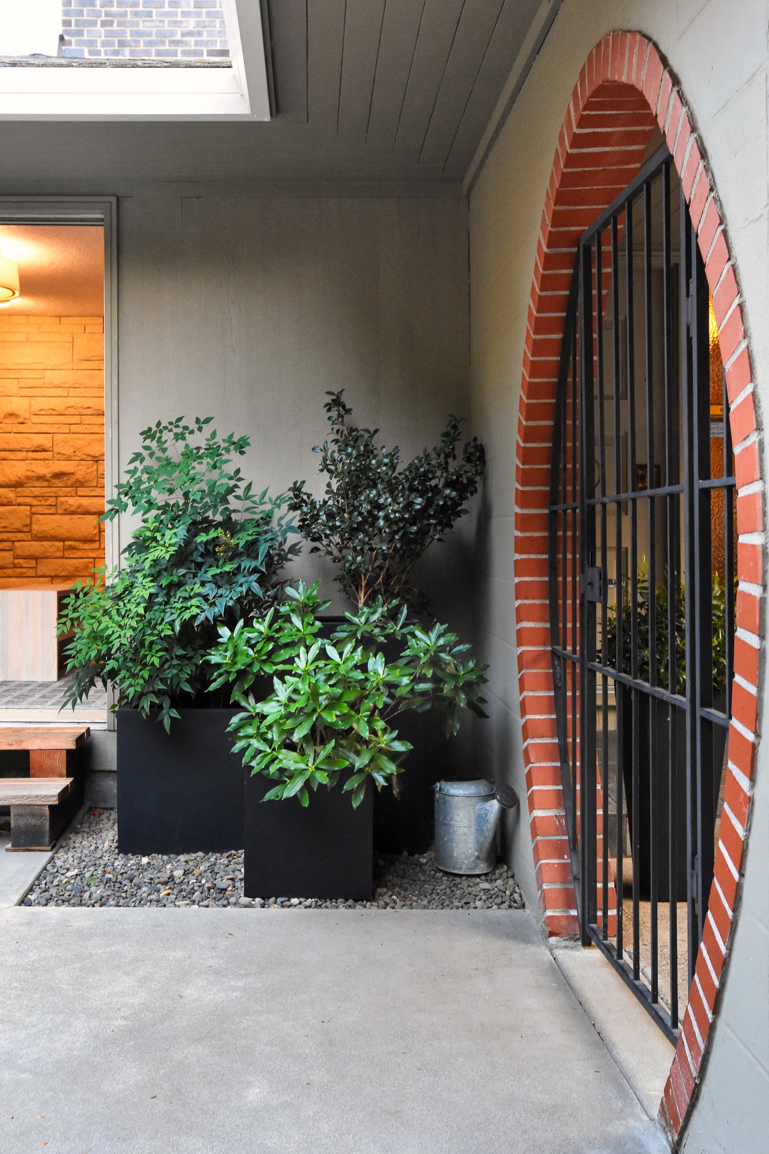 The L-shaped, mid-century modern home opens up to an expansive central courtyard featuring a large Ipe wood deck, a roomy sand-finished concrete patio and a steel, wood-burning fire pit area with a custom cedar slab bench — all flanked by custom steel planters — to create a variety of outdoor garden spaces ready to be enjoyed throughout the spring, summer and fall.