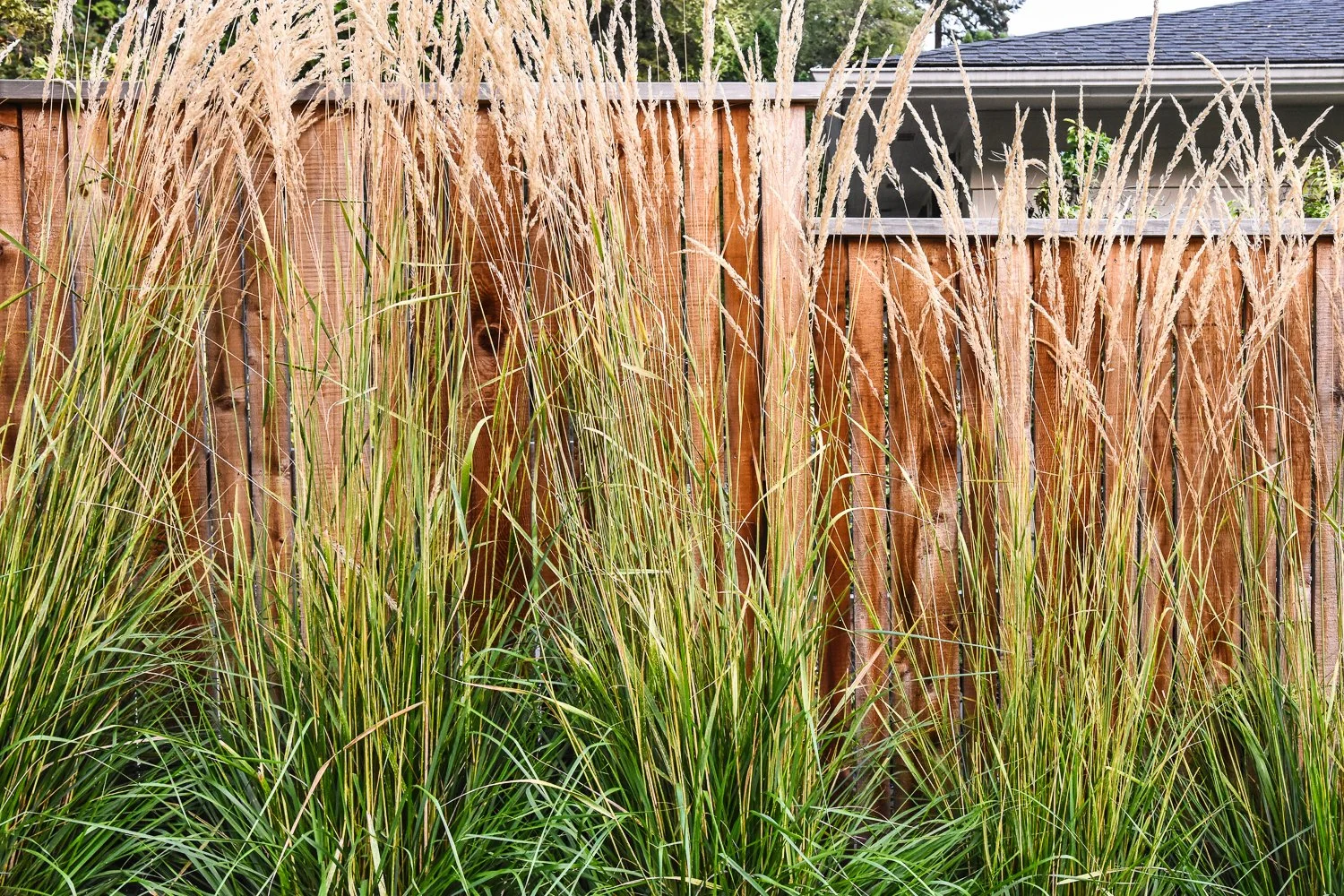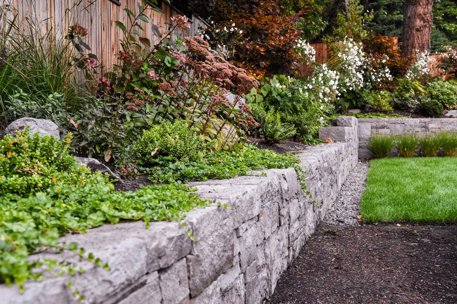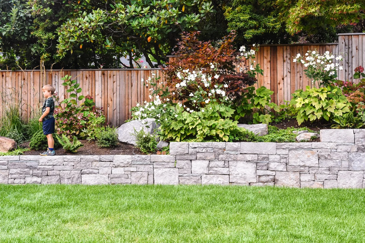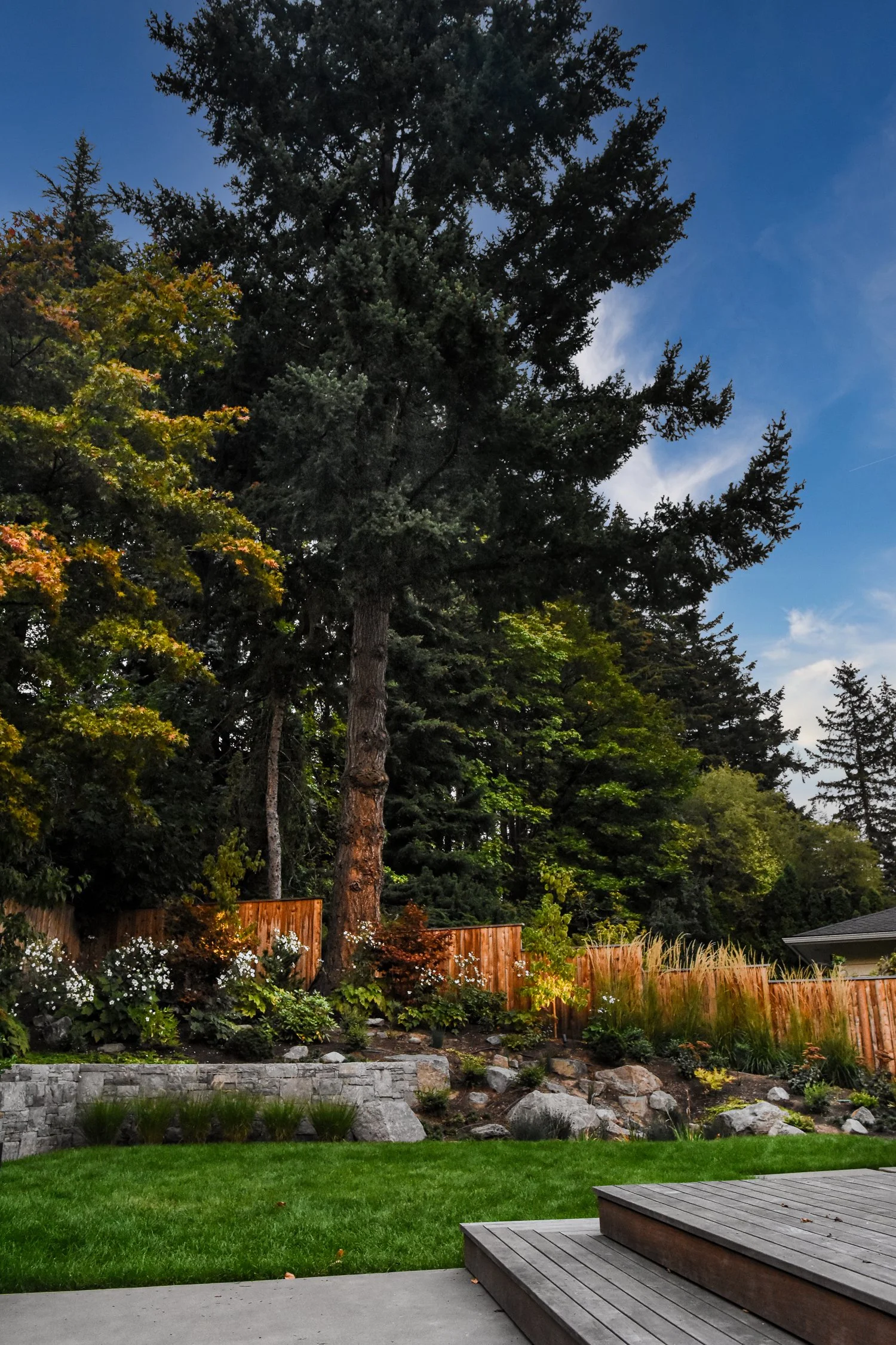 In the backyard, a steep hill tumbles down to a series of chiseled natural stone retaining walls with rustic, clean edges. At one end, the handsome walls give way to a disintegrated collection of decorative landscape boulders before resolving with a rain garden planted with colorful purple Iris and verdant rush grasses that helps manage stormwater in the winter months.