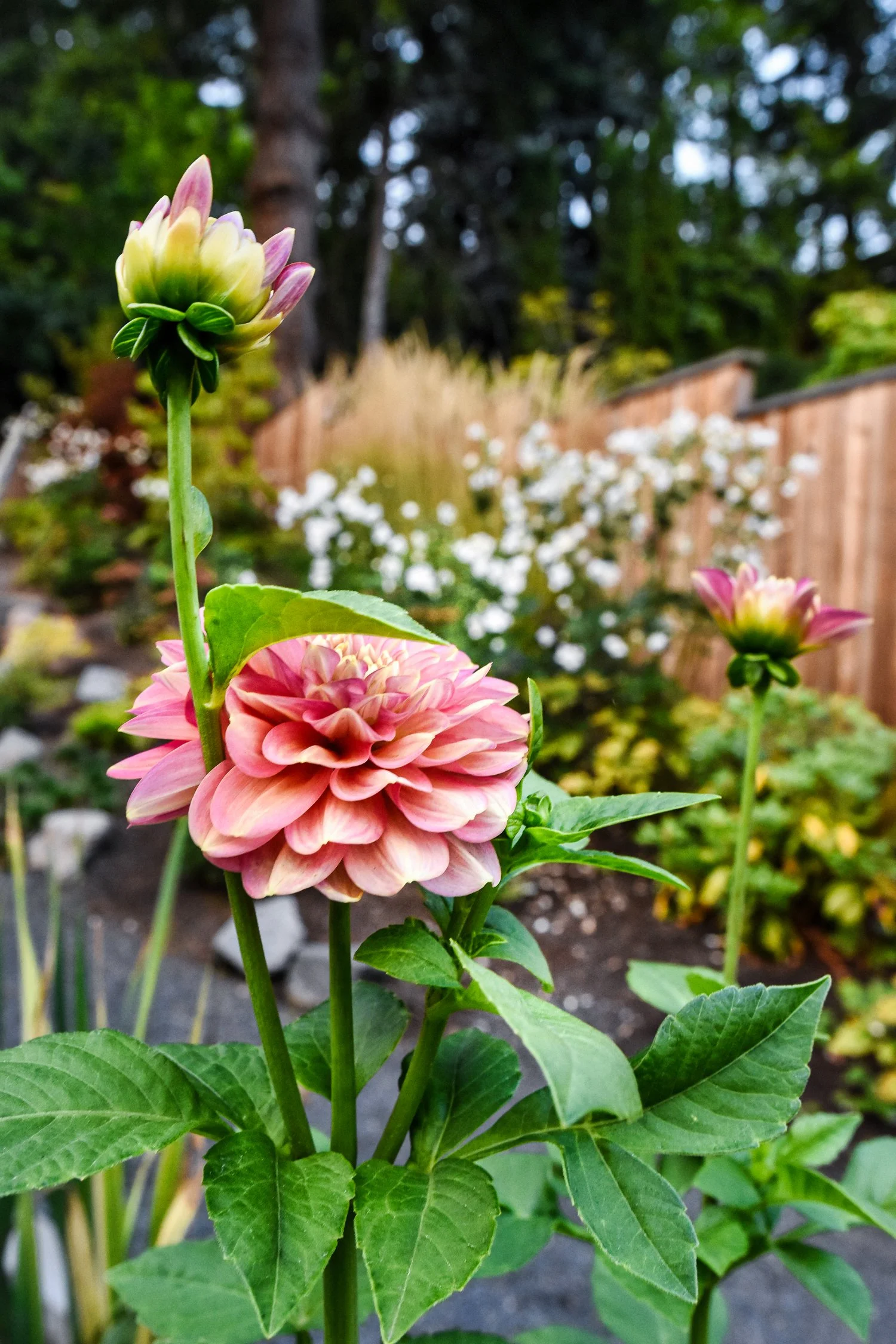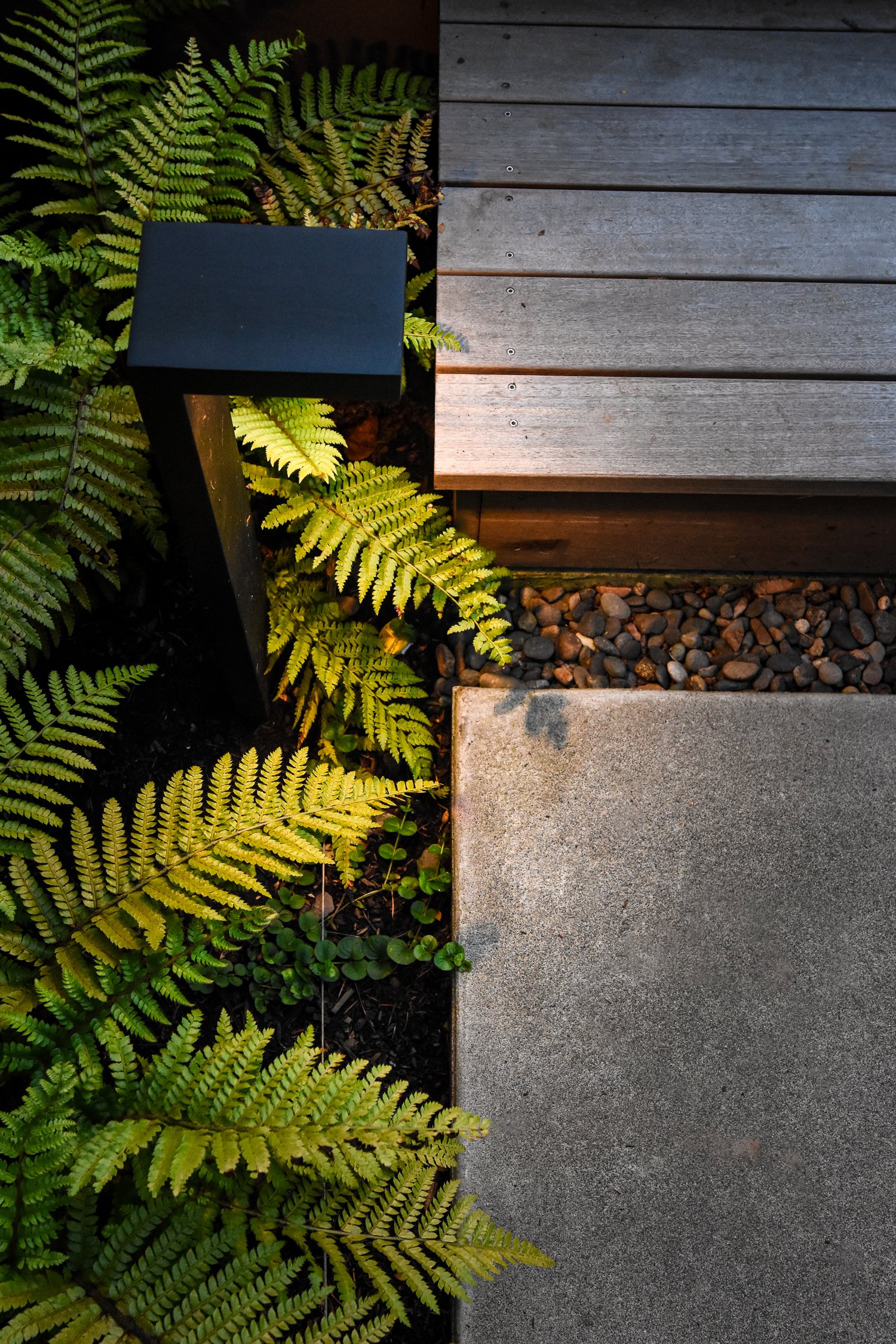 The varied topography of the sprawling landscape outside this attractive Mid-Century Modern home in the Cedar Hills neighborhood of Southwest Portland, marked by steep slopes and a backdrop of majestic and mature Douglas Fir trees, presented the Pistils’ design team great opportunities to create a truly dynamic garden with a variety of handsome and functional outdoor rooms.