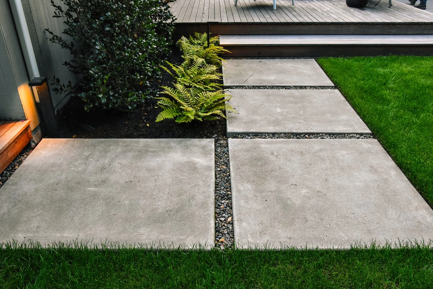 Far from uniform, the large concrete slab pavers connecting the spaces intersect at unique angles, informed by and mirroring the unique architecture of the home.