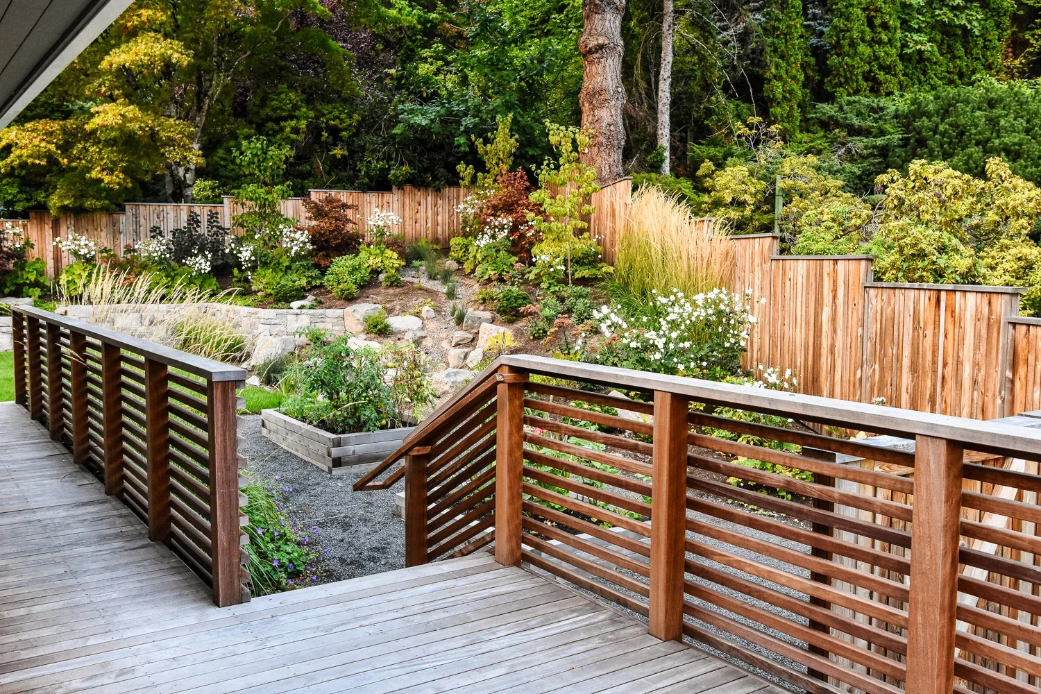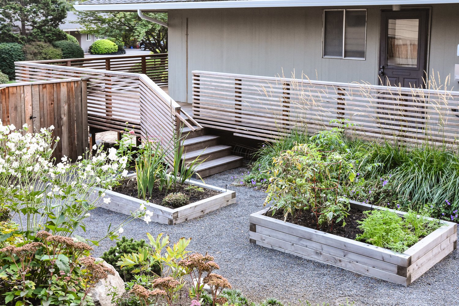 Starting on the home’s west side, stairs lead up from raised cedar garden beds to a large, custom Ipe wood deck, creating a lookout from the living room to the lush, multi-faceted garden spaces.