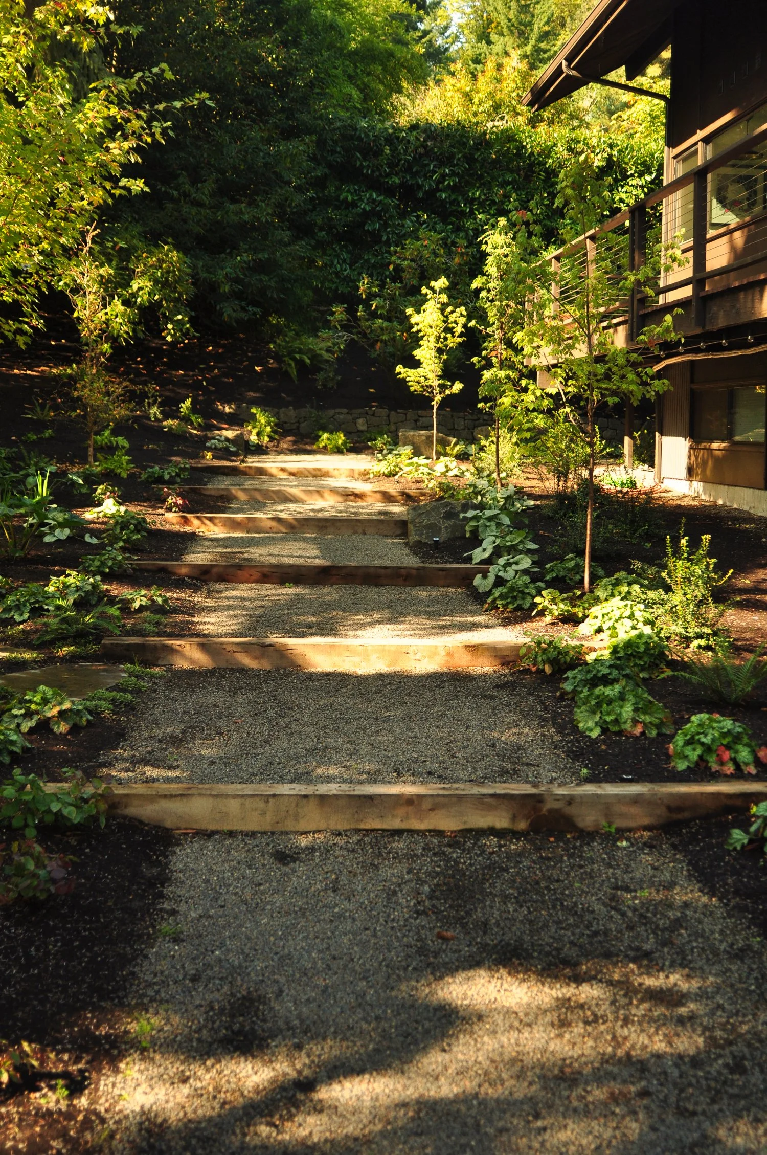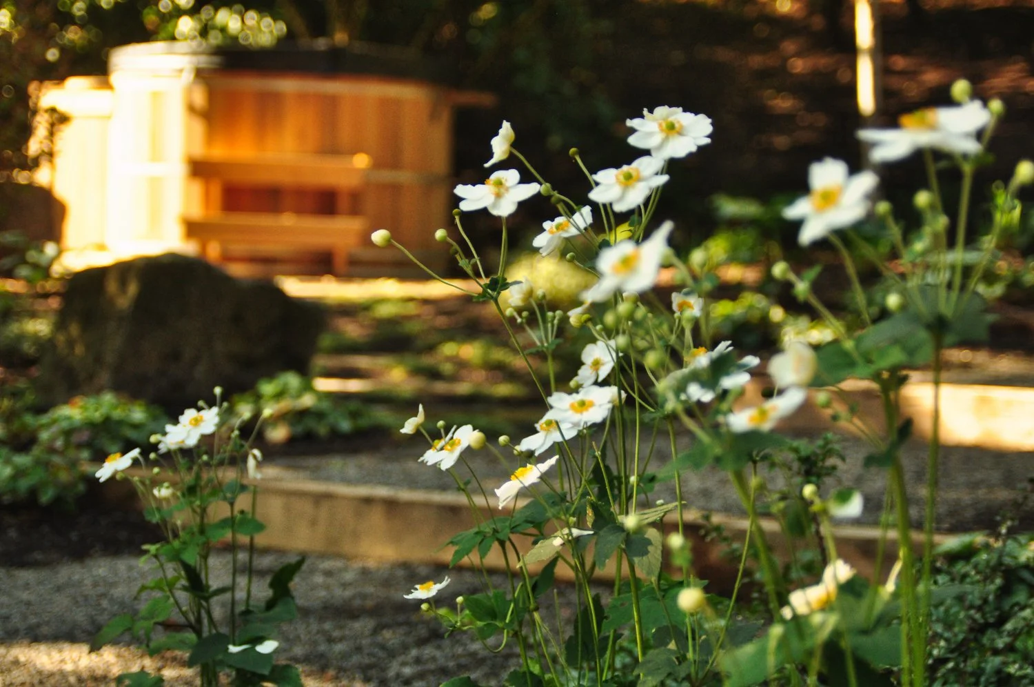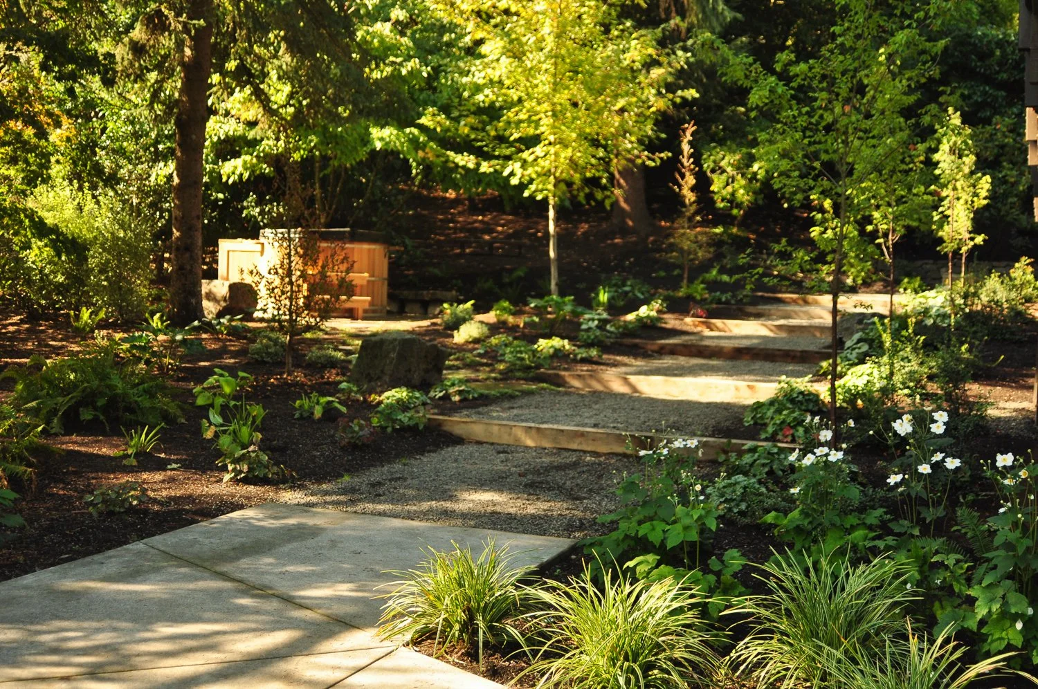 Adjacent to the patio spaces is a spa zone with a circular cedar hot-tub set on crushed basalt gravel in a lush woodland garden.