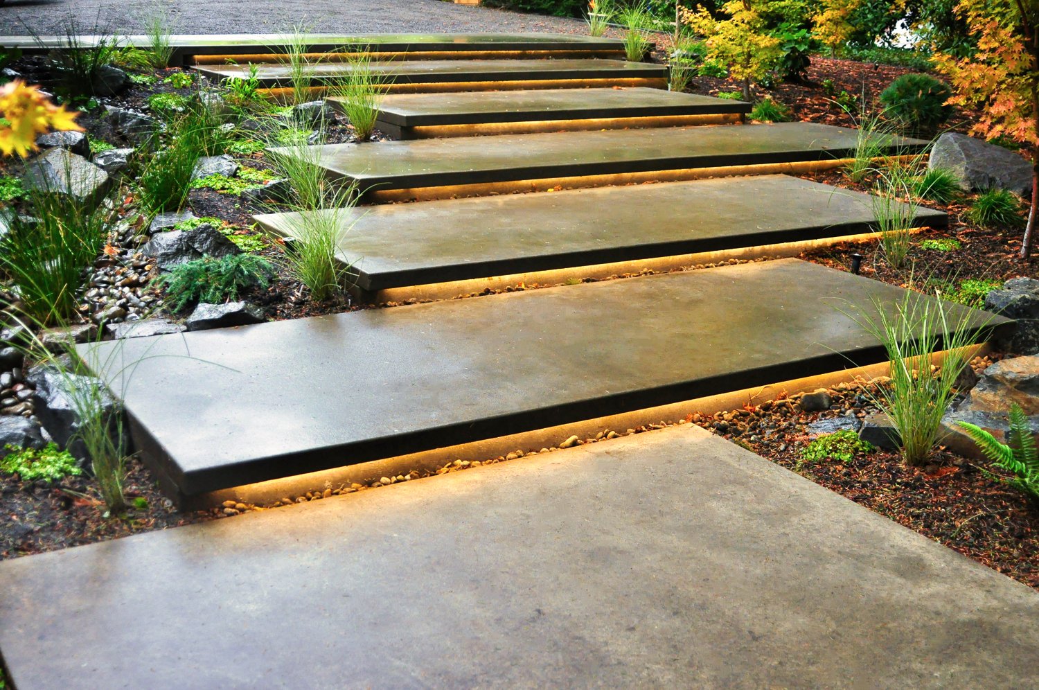 The primary pathway to the backyard garden features a series of staggered, cantilevered sand-finish concrete stairs with under-lighting, to create a dramatic entryway into this multi-faceted garden. A rain garden flows under the stairs and throughout the property to creatively manage stormwater, invite beneficial wildlife, and add a dynamic visual element to the landscape.