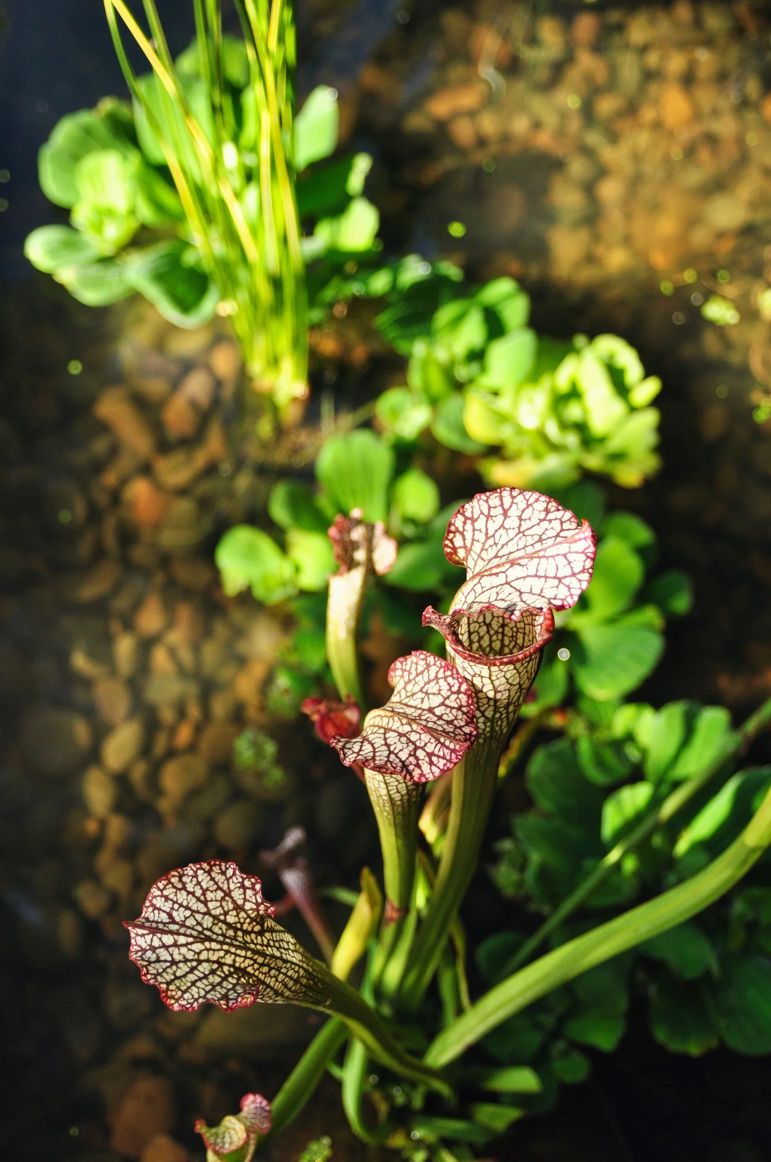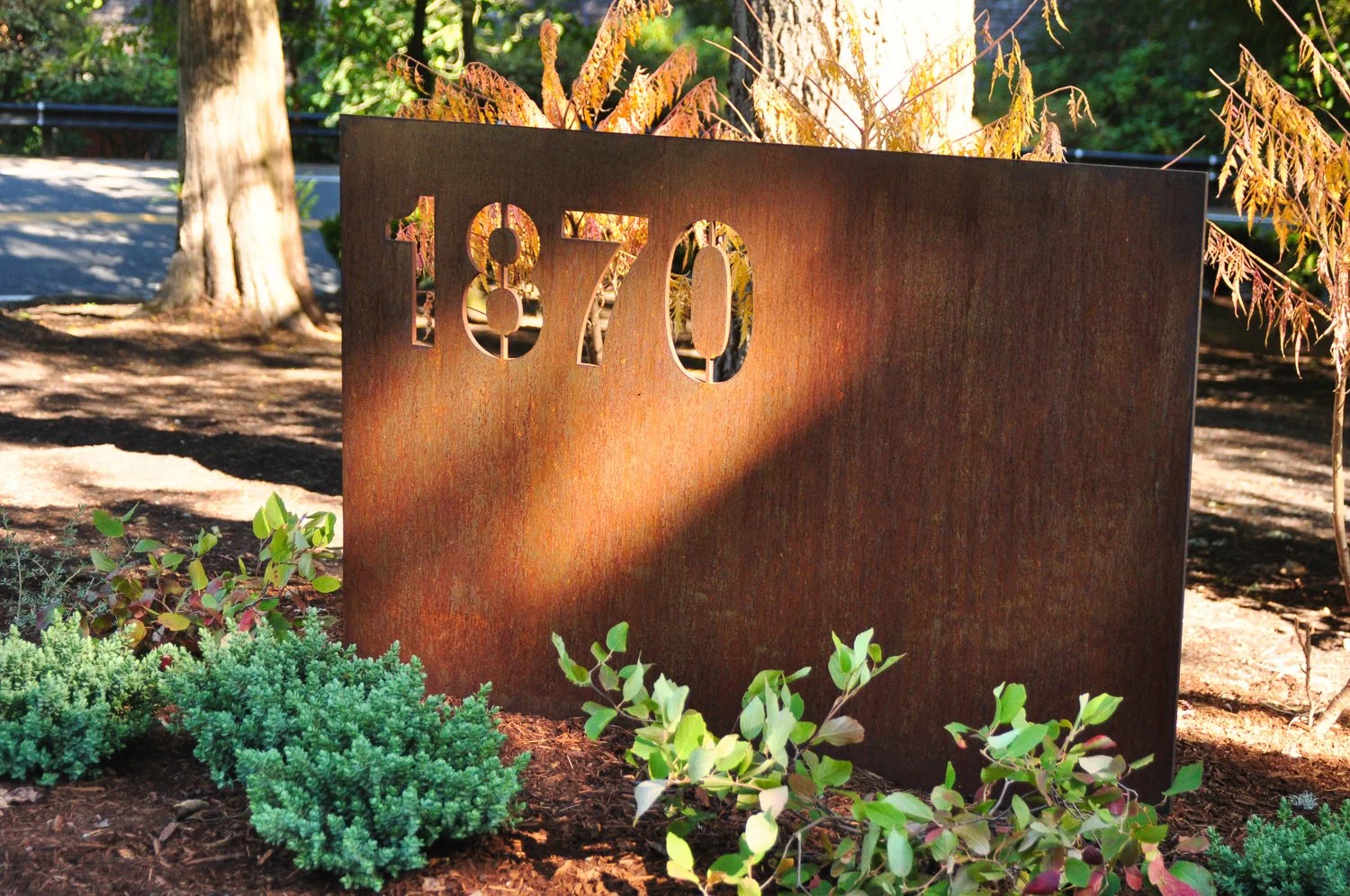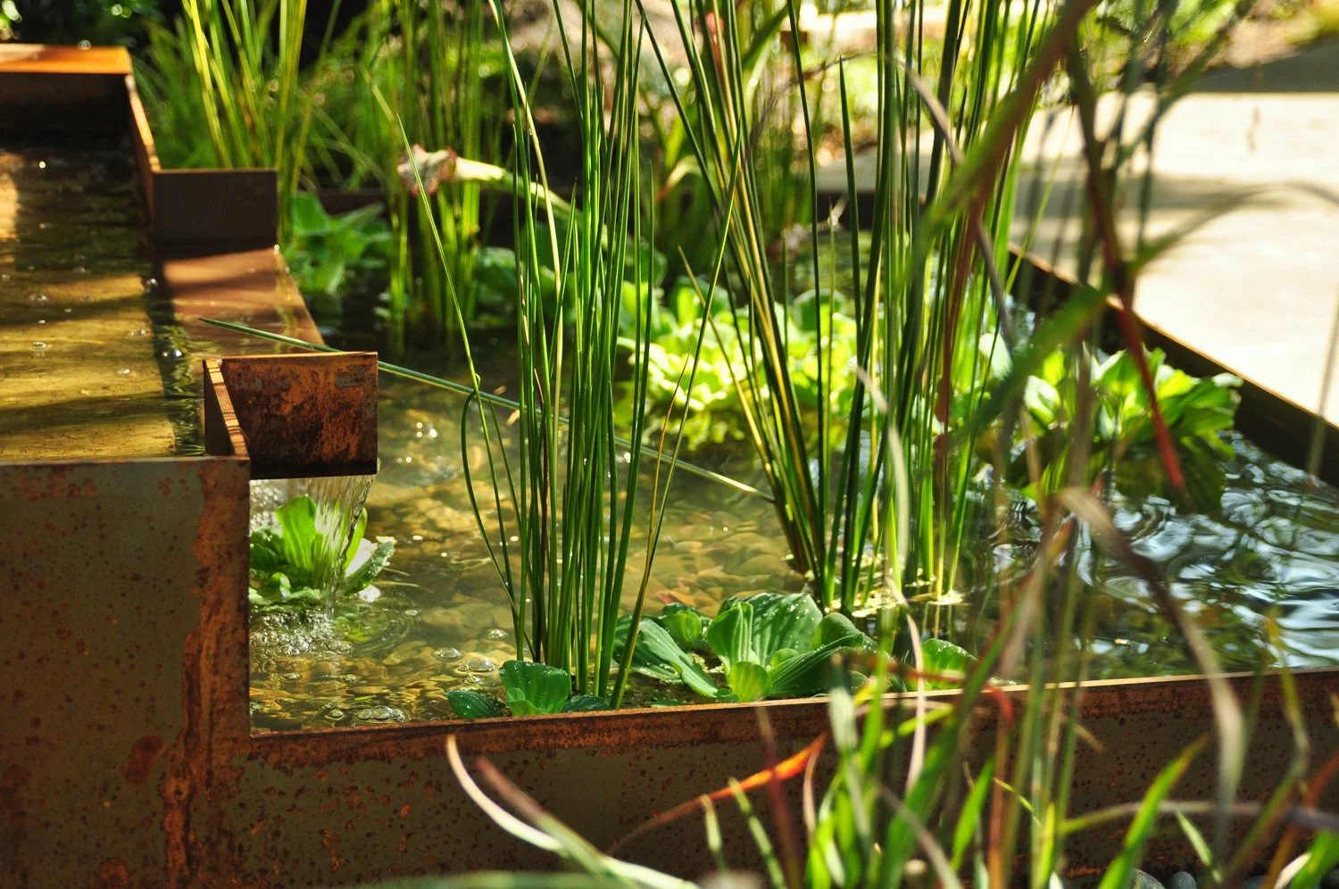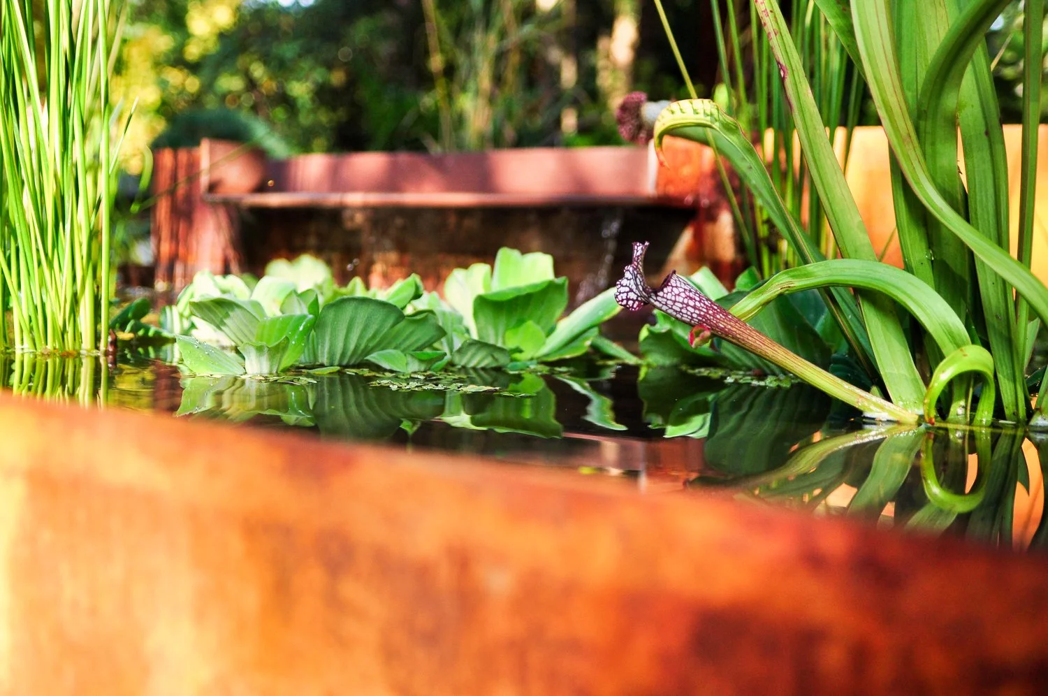 Weathered steel hardscape features include a patio-side water feature with carnivorous Sarracenia and a modern road-side address plaque.