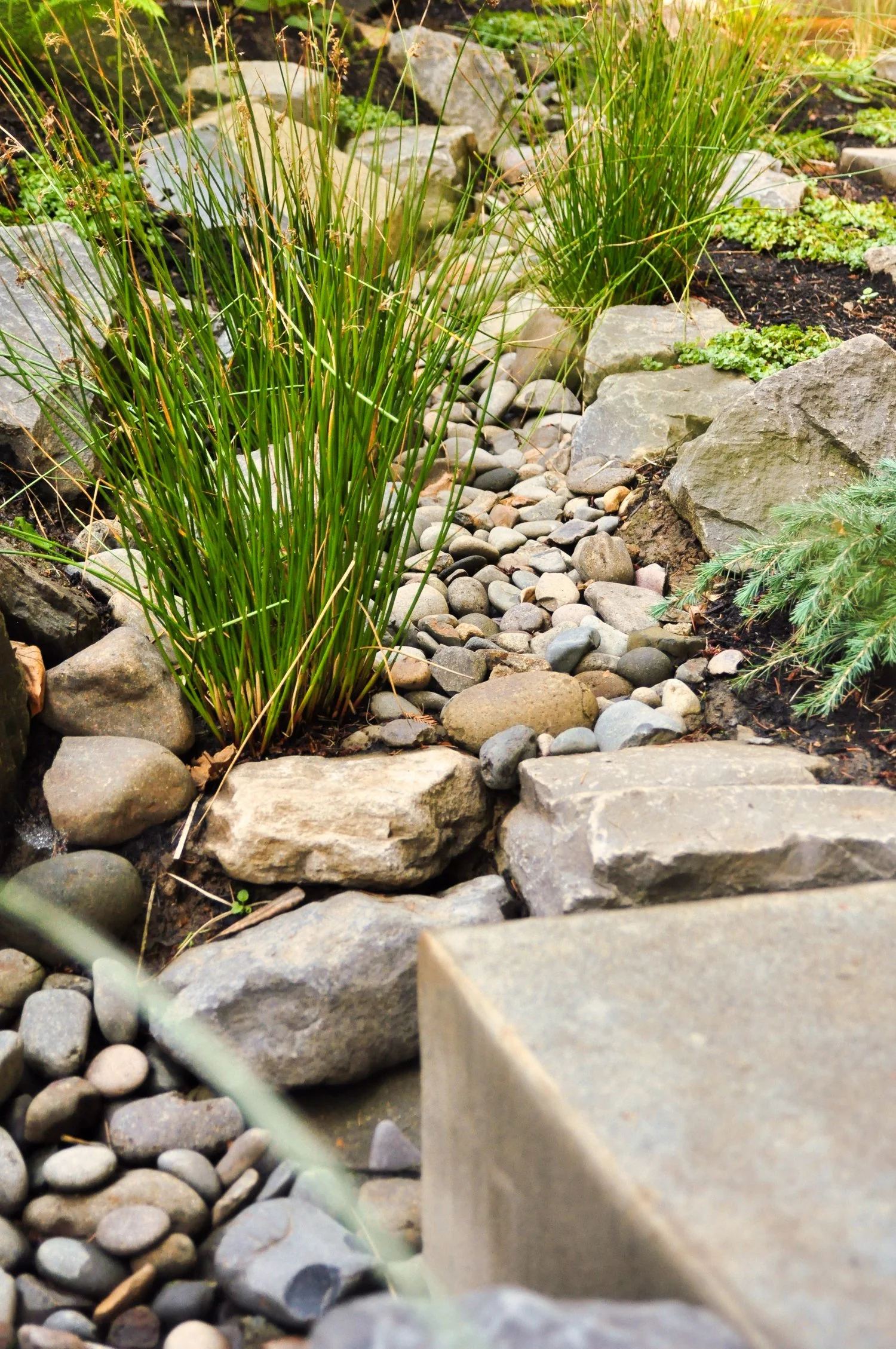 Plantings range from classic Japanese Maple trees to ornamental Miscanthus grasses to colorful perennials like Japanese Anemone, affording the landscape year-round texture and color.