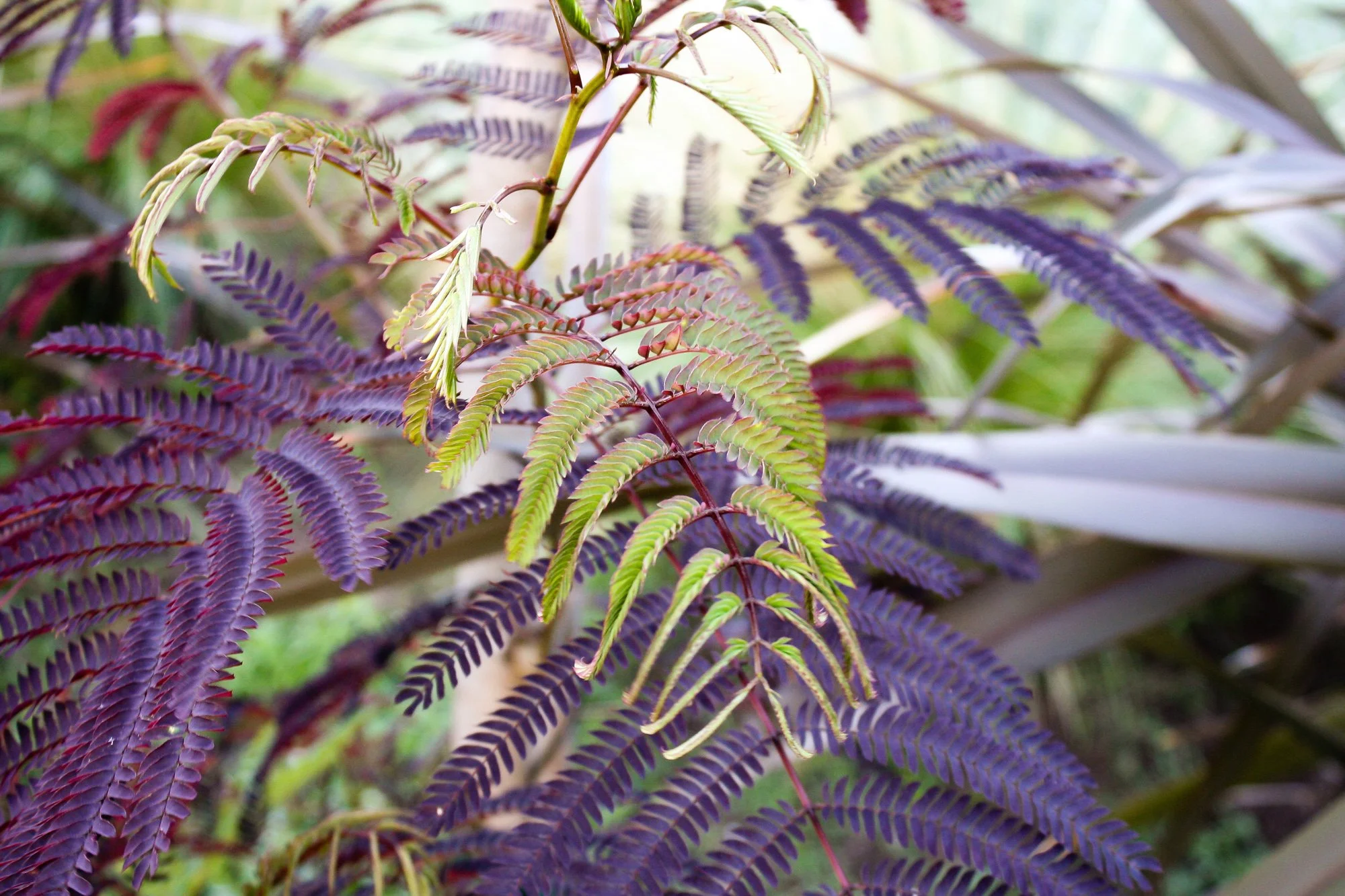 The colorful and diverse plant palette includes a wide array of herbaceous perennials, ornamental grasses and evergreen plants, with specimens like Mimosa 'Summer Chocolate,' Edgeworthia chrysantha, Phormium and Crepe Myrtle 'Natchez.'
