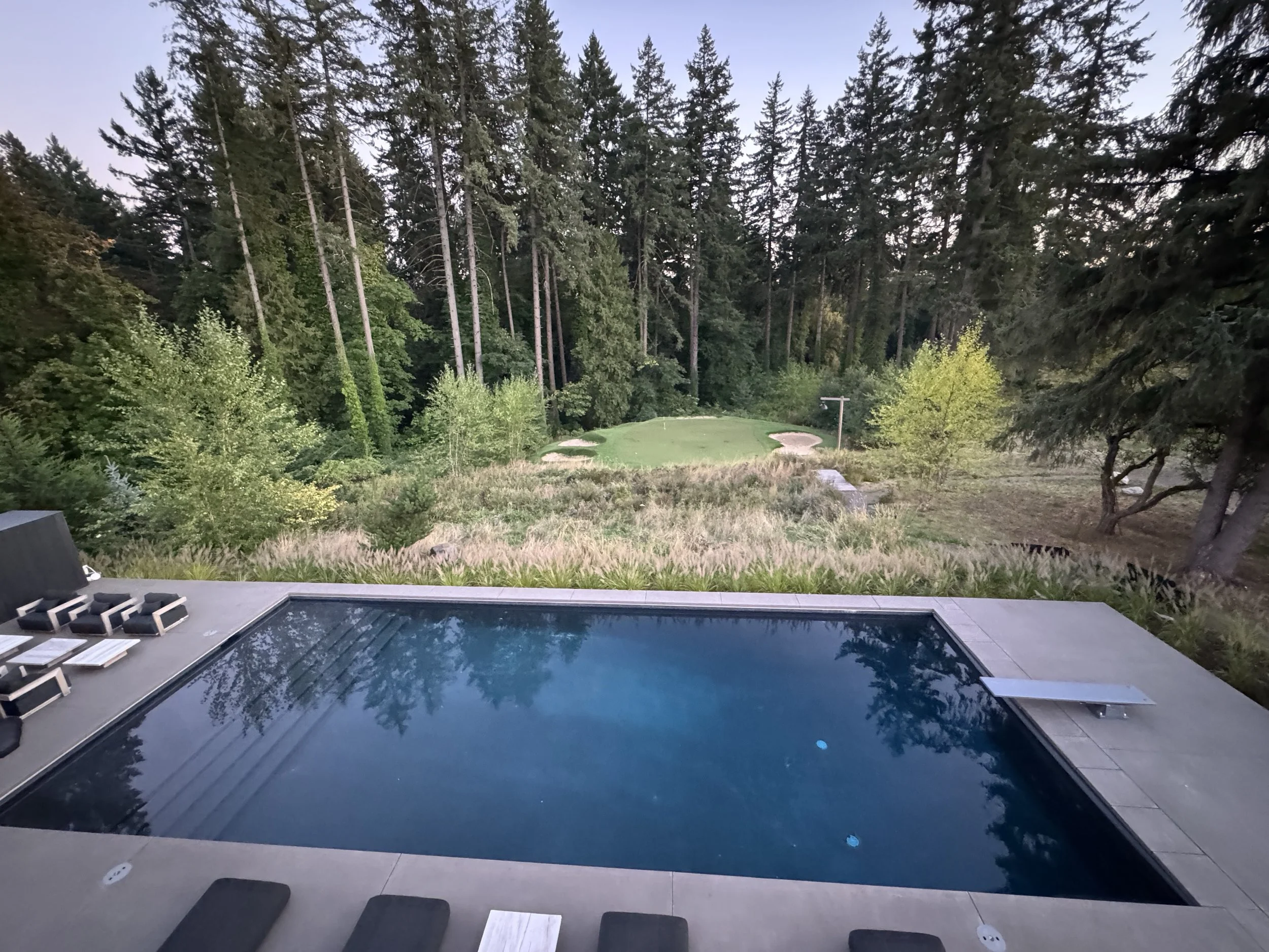 Beyond the backyard patio, an expansive lawn overlooks the pool area, a natural meadow with a large rain garden, and golf green below — all set against the stunning backdrop of a tall, conifer forest.