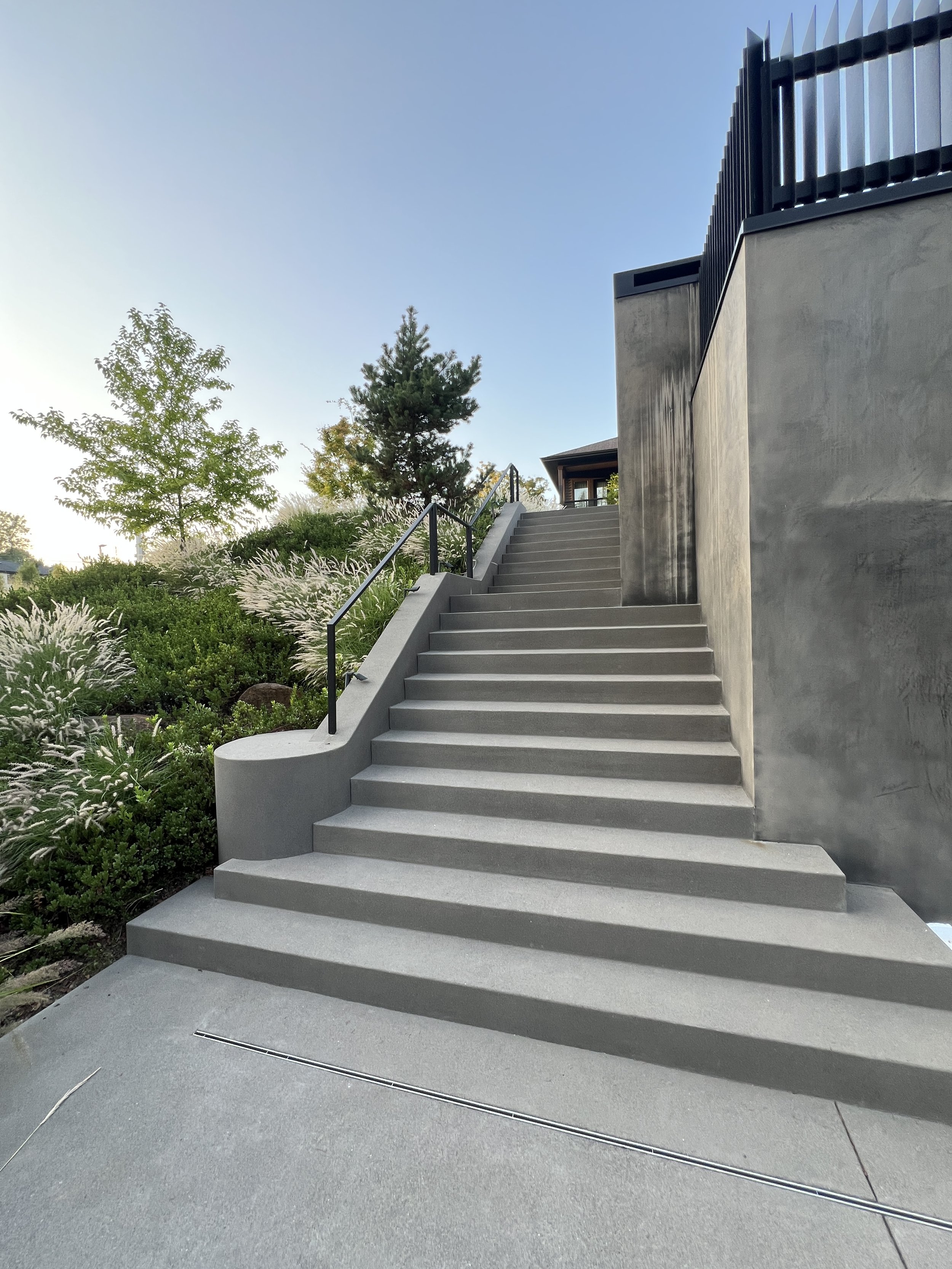 The backyard features a spacious patio with a hot tub and a series of inter-connecting walkways constructed with elongated, concrete pavers, set in a staggered pattern and interplanted with grasses and perennials.