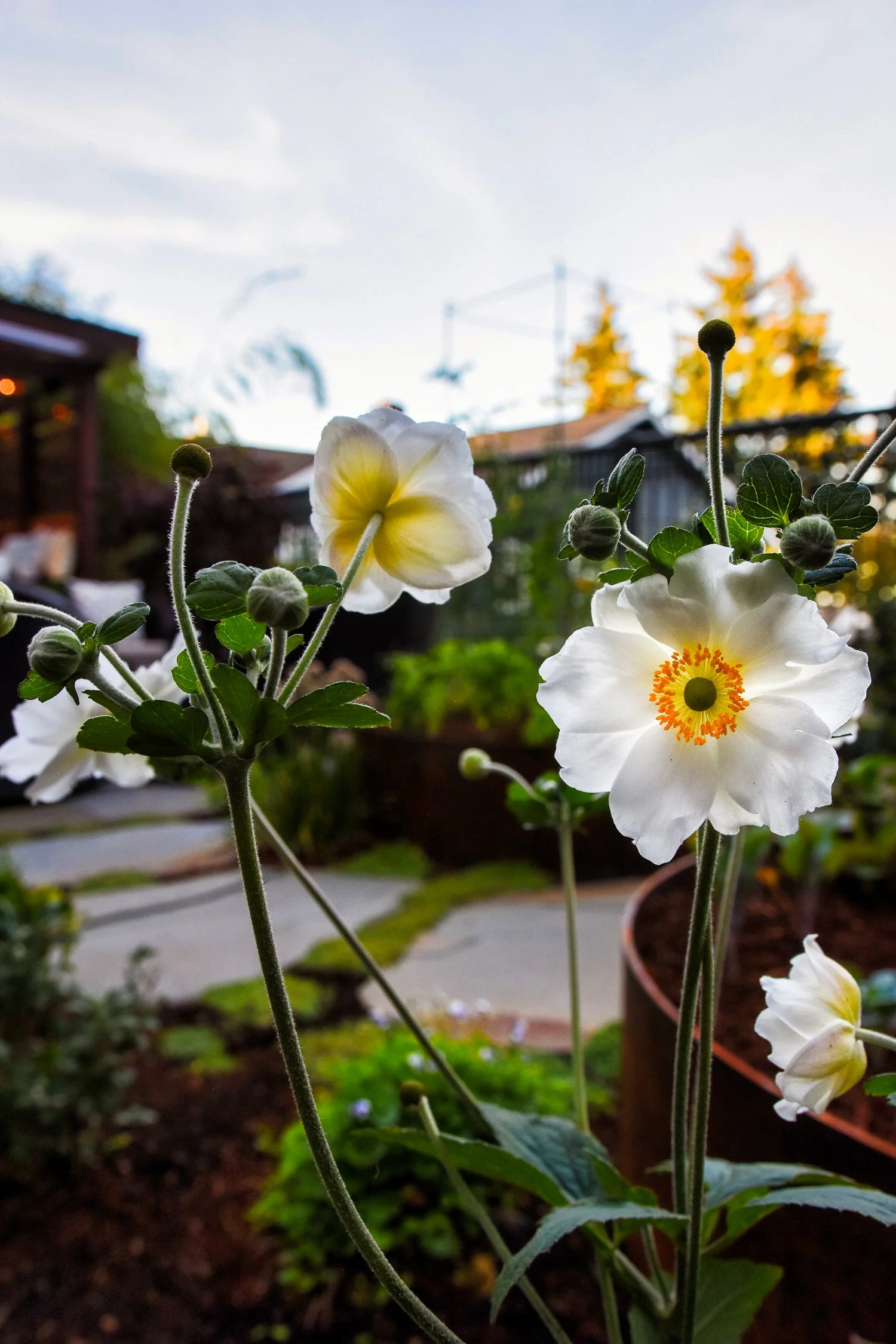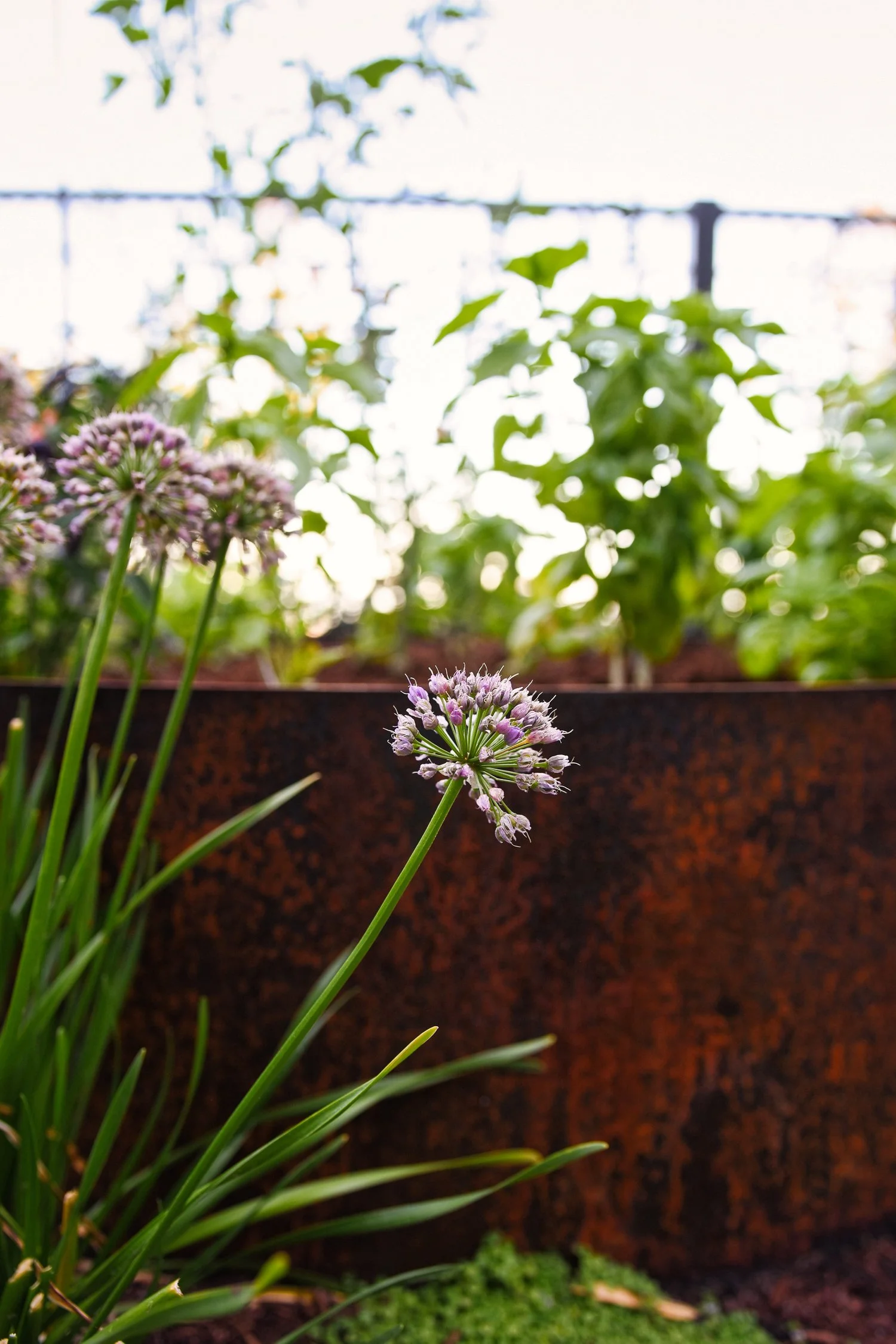 A collection of weather-worn, circular steel planting beds for herb and edible gardening, linking to the central yard with stepping stones, ensconced with soft ground cover plantings, create an unexpected and attractive production zone in this modest space.