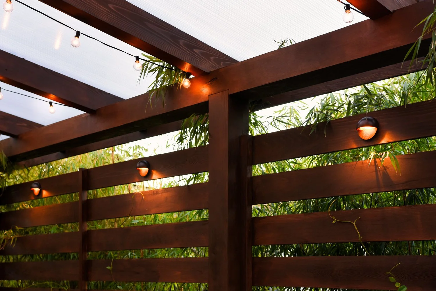 A well-appointed spa zone with a hot tub covered by a handsome, timber framed structure to protect from the winter elements is grounded with a comfortable Ipe hardwood deck and adjacent seating areas. A translucent roofing material ensures abundant natural light, even in Portland’s darkest months. And ample wood slatting and stands of bamboo beyond create a strong sense of enclosure and privacy.