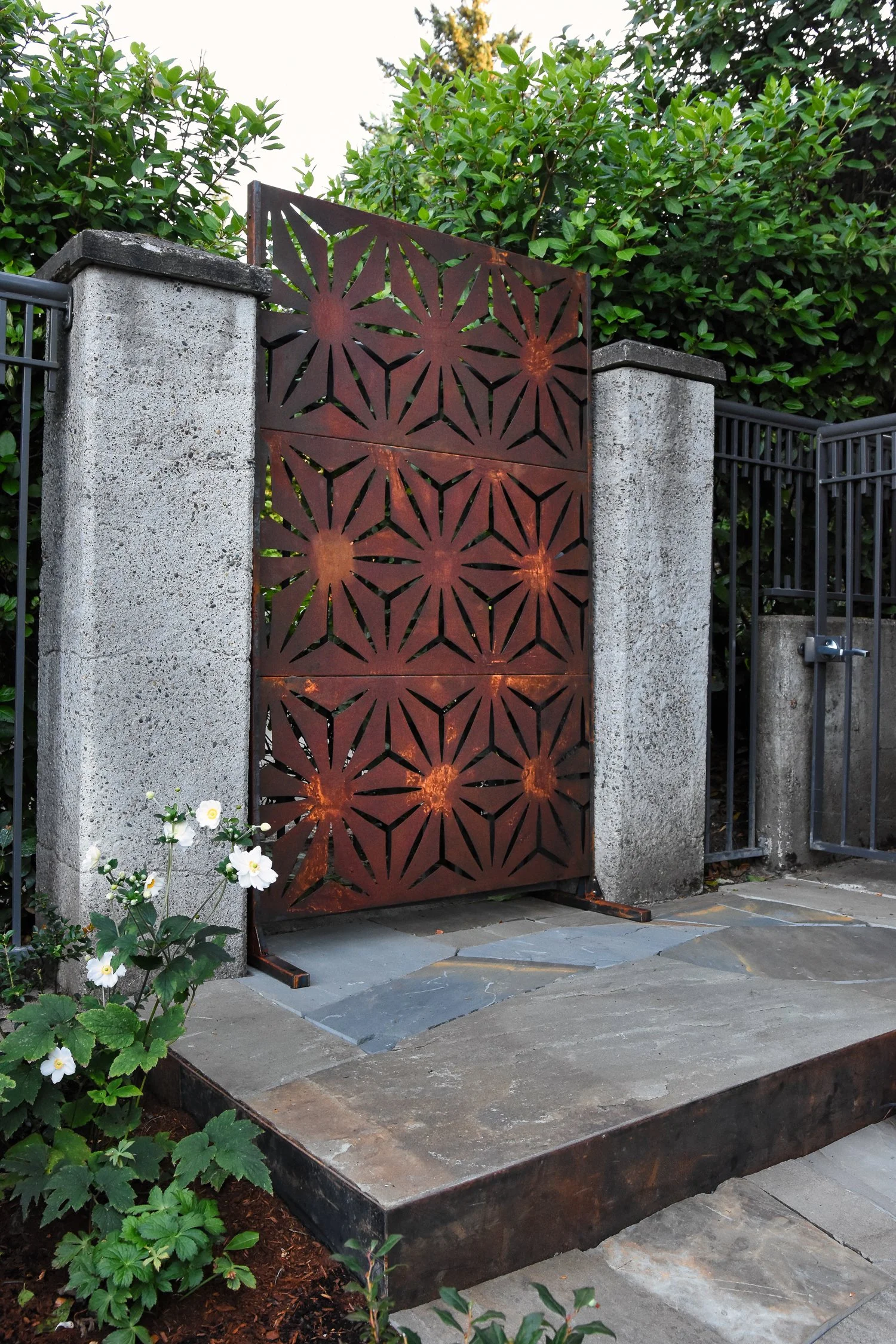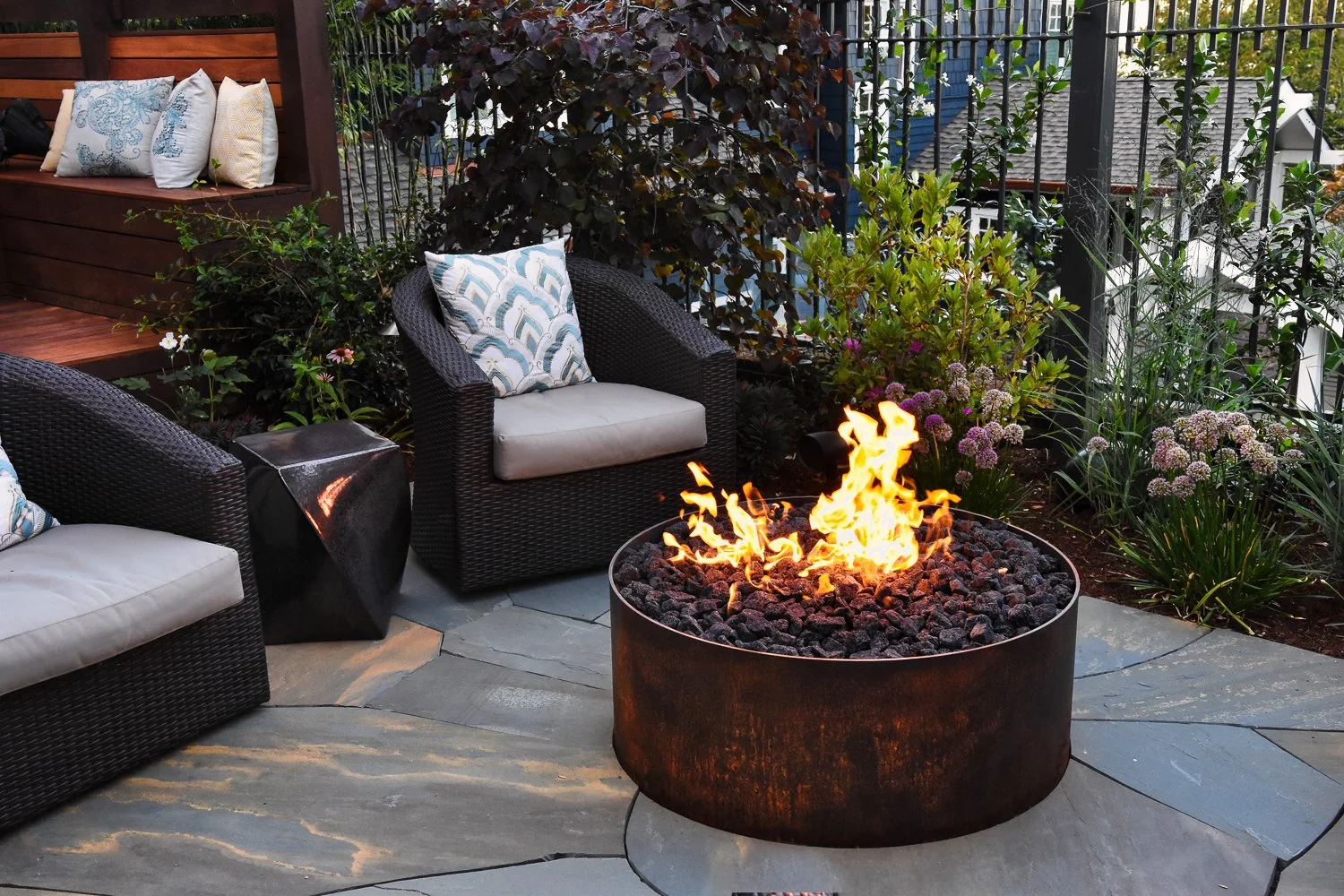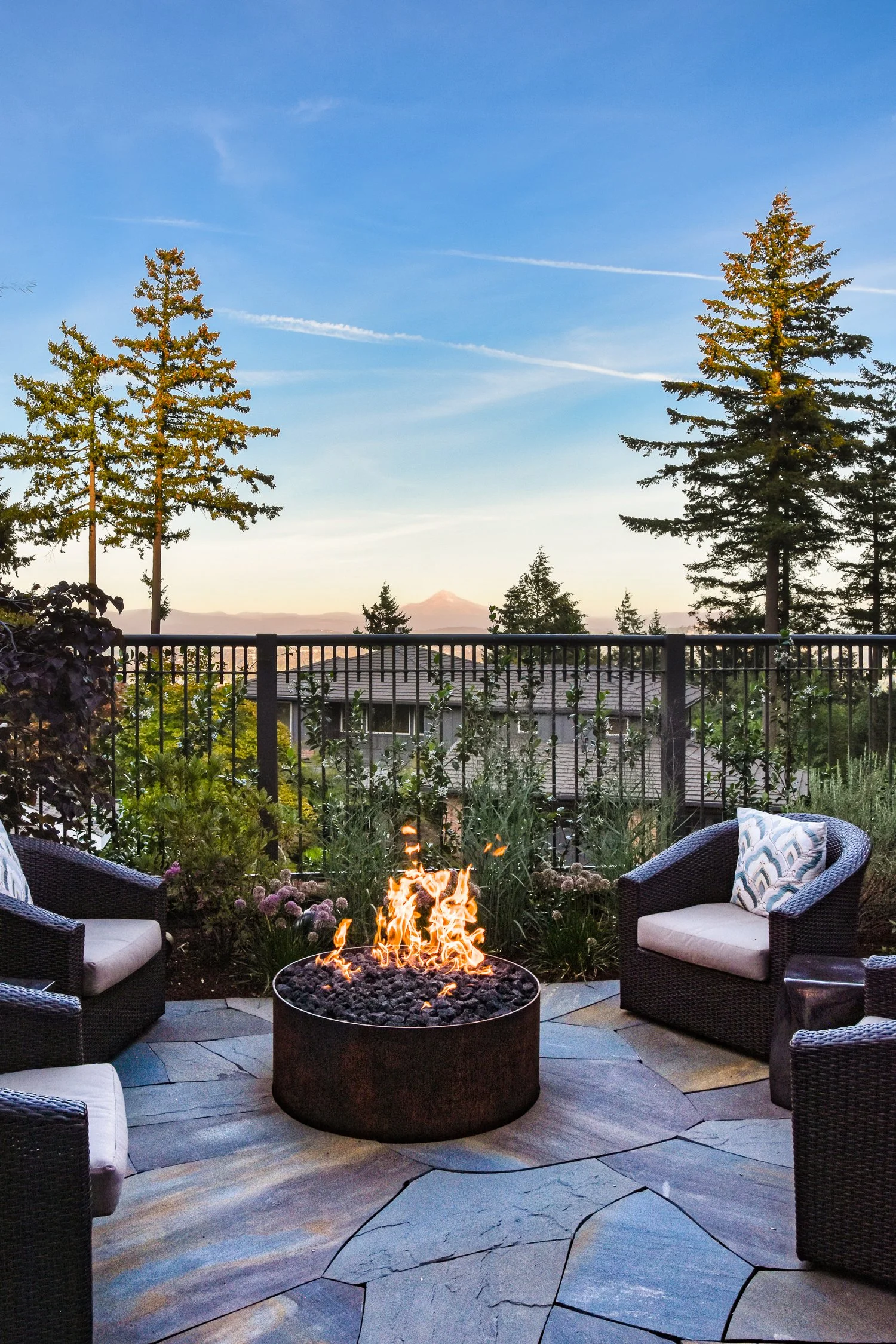 Featuring a series of stylish and comfortable interconnected spaces, bluestone pathways surrounded by lush plantings lead to a roomy, tight-jointed bluestone patio with a custom steel gas fire pit at the center of the backyard, inviting visitors to linger and gaze out through the mature fir trees to the mighty Cascade Mountains on the horizon.