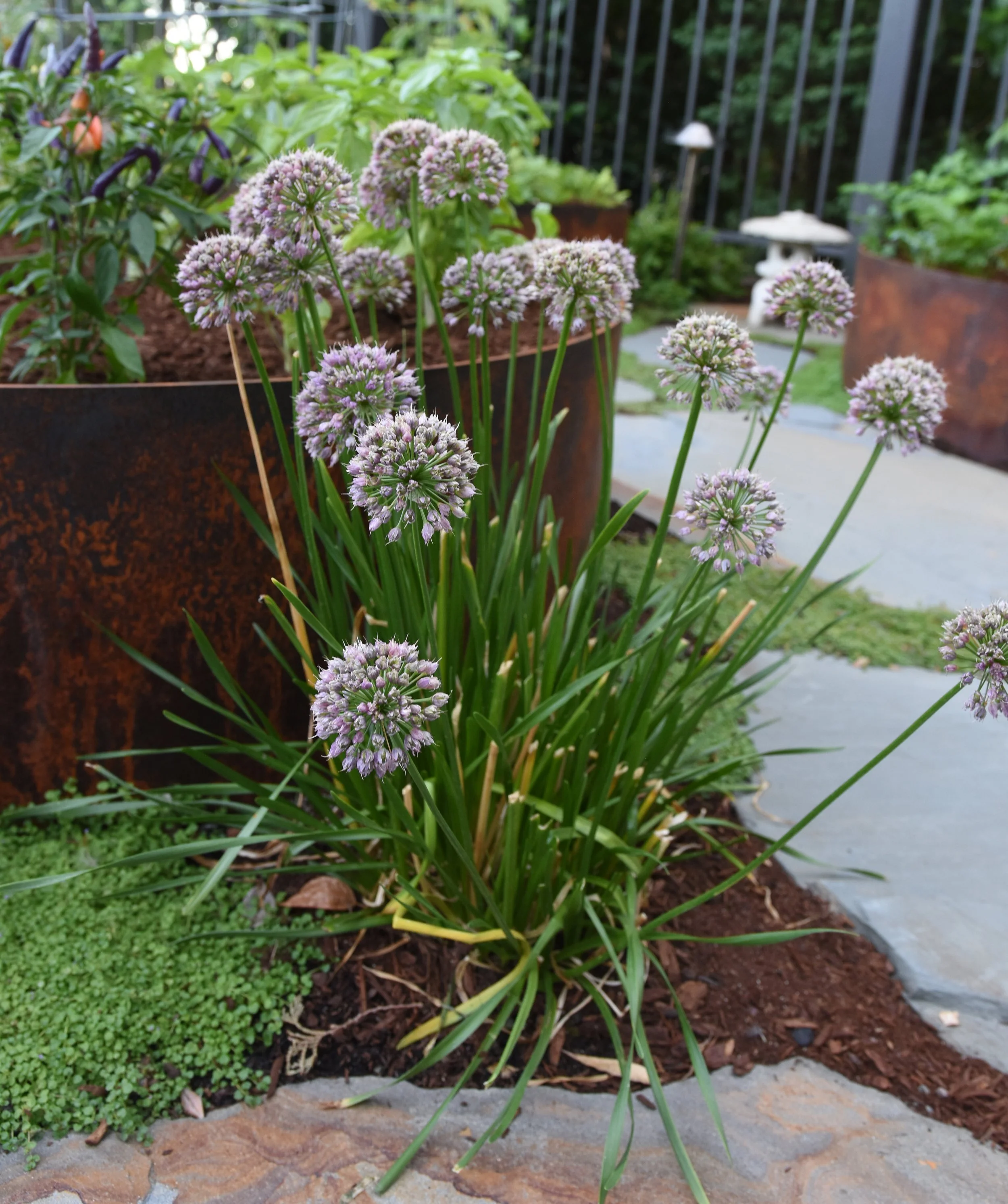 An eclectic mix of colorful of perennials including Allium, Echinacea, Japanese Anemone, Lavender, and evergreen Jasmine vines bring color, fragrance and seasonal interest to throughout the garden.