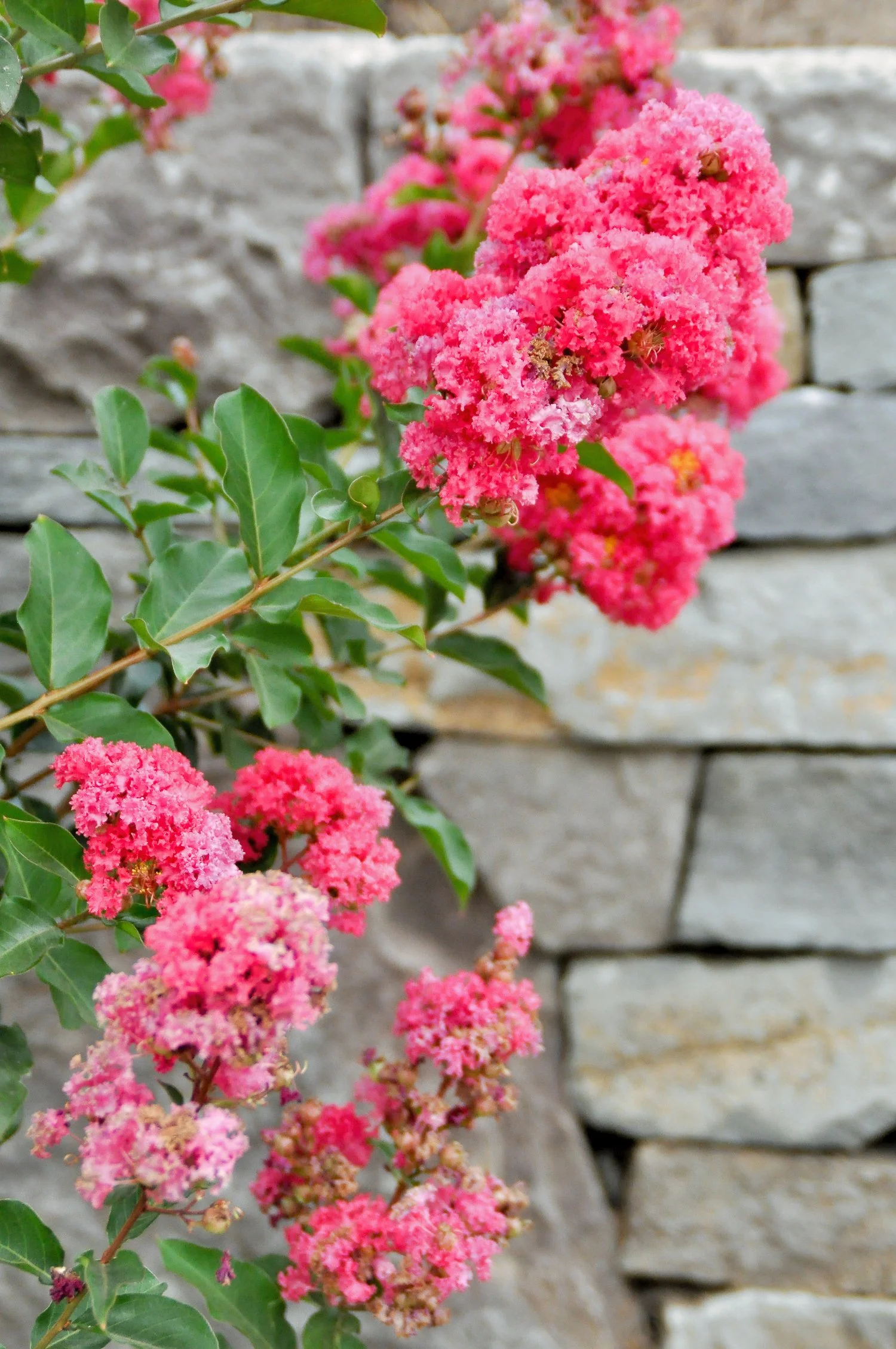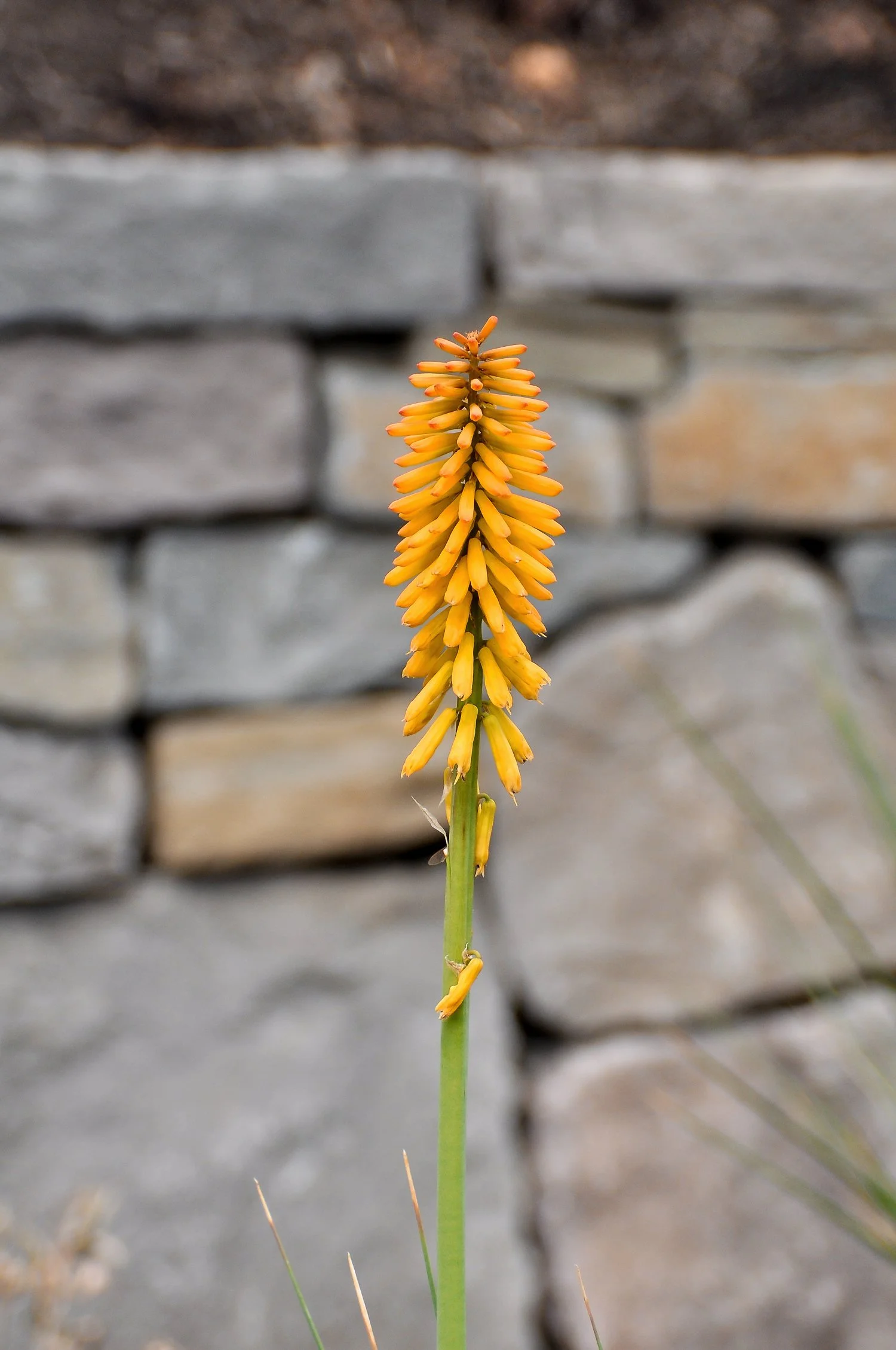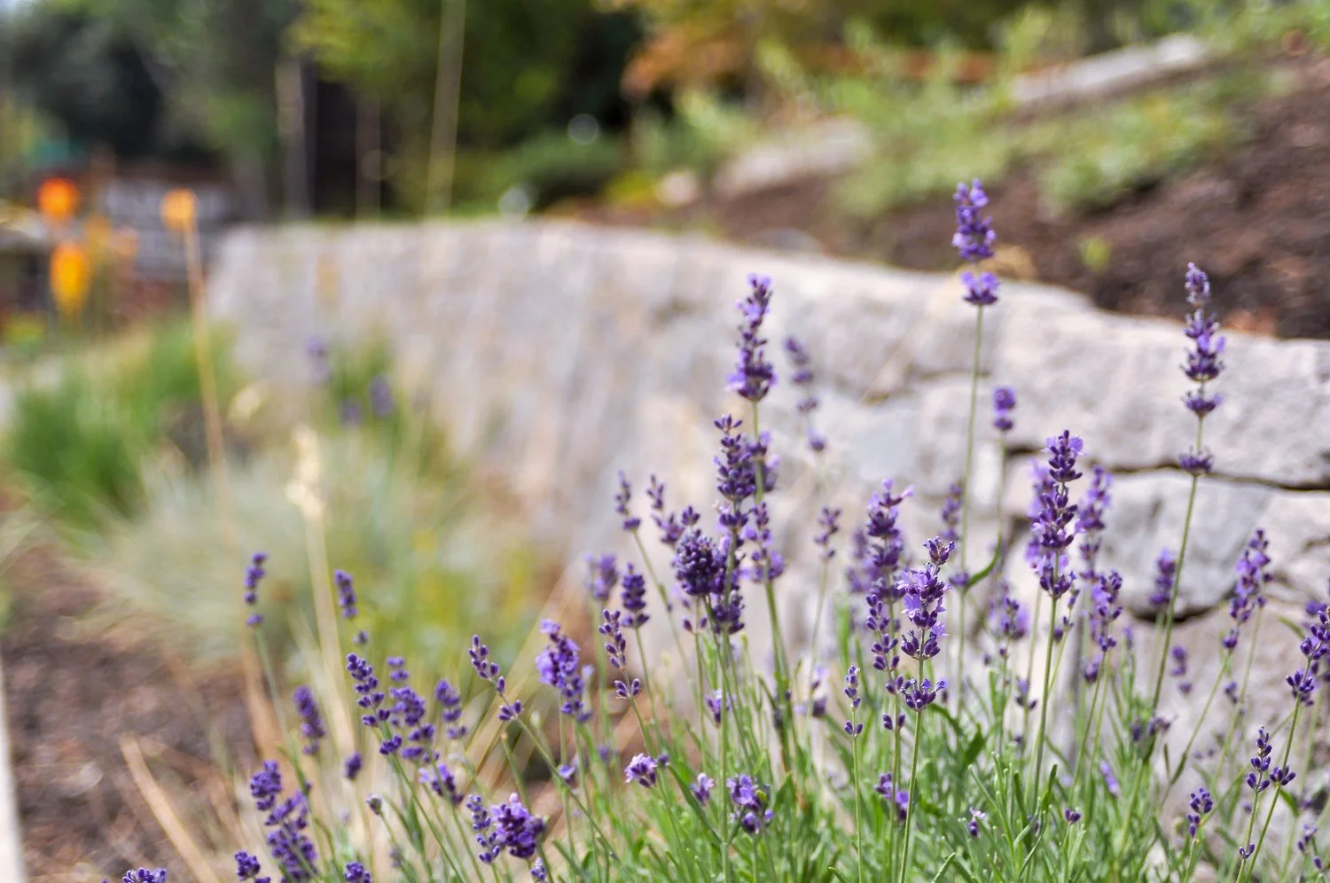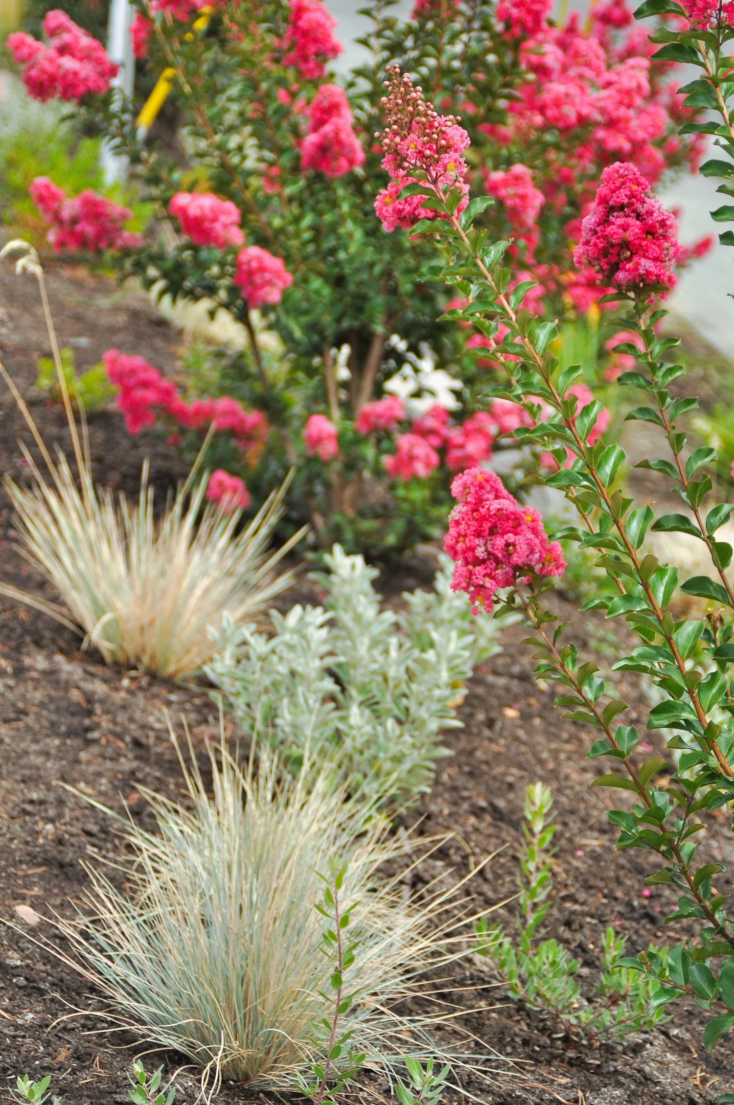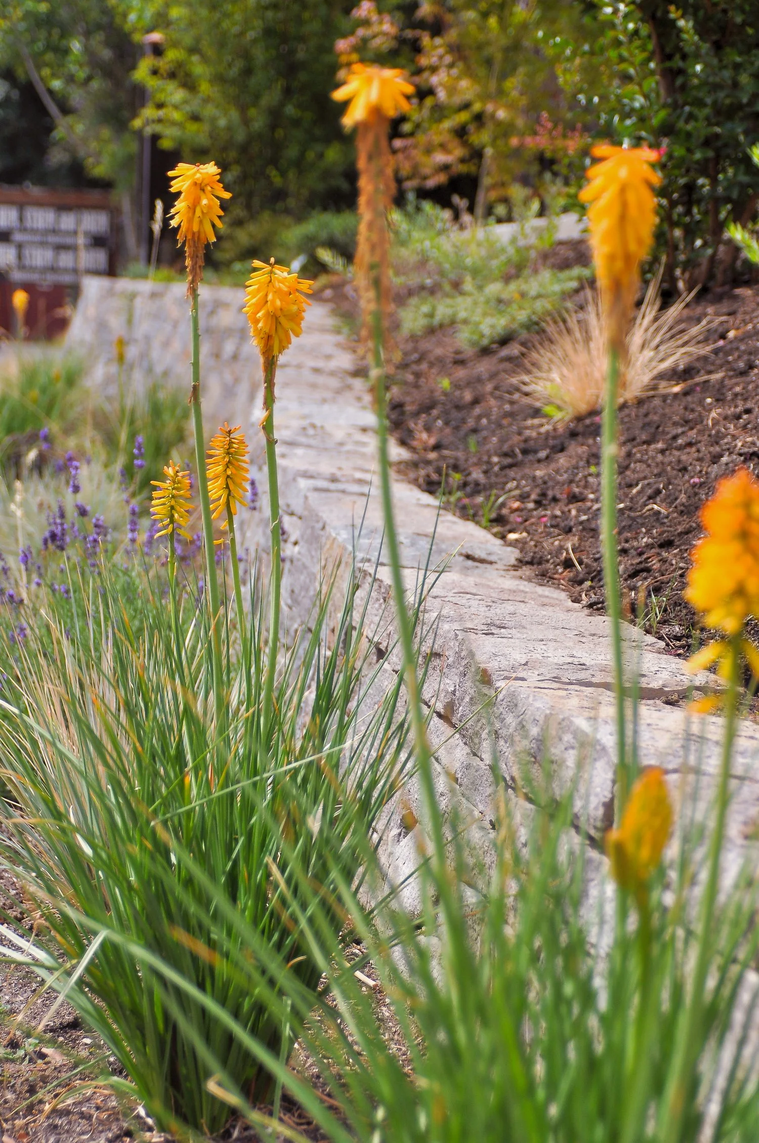 Planting beds between and around the walls feature bright, colorful plantings such as Sedum, lavender, Crepe Myrtle and Kniphofia 'Red Hot Poker.'