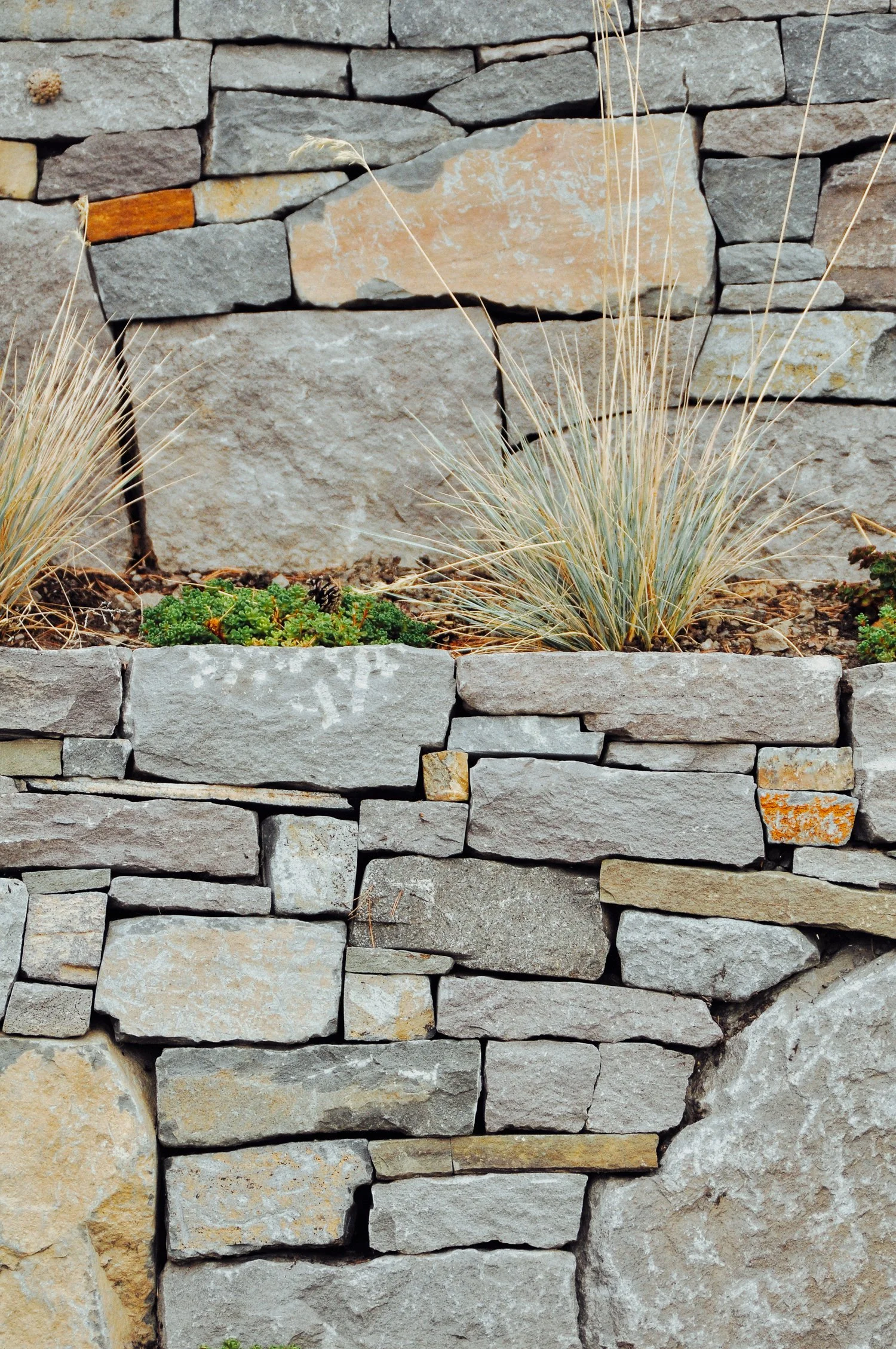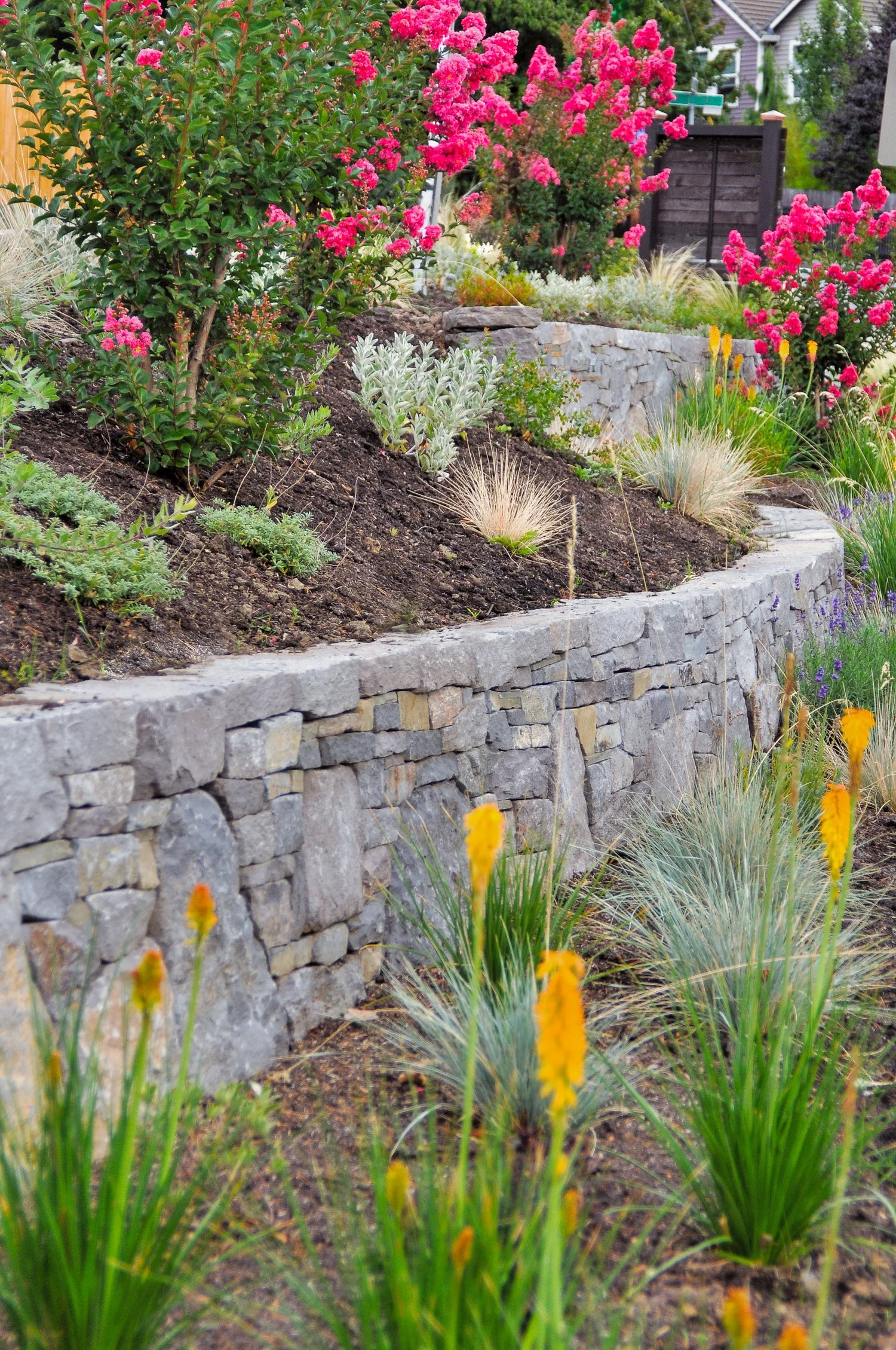 The visual and functional centerpiece of the design is a series of expertly crafted, natural stone retaining walls, that create a collection of terraces to manage the steeply sloped landscape along the road. Pistils’ talented stone masons painstakingly chiseled and cut-together several tons of Pacific Northwest native basalt to form tight joints and a series of rustic and handsome, interwoven patterns, from end-to-end.