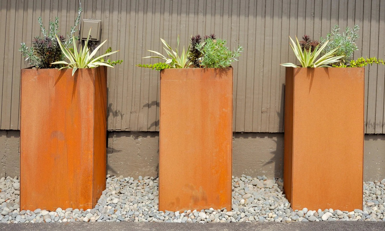 Rustic steel planters and an elegant steel trellis, custom fabricated by Pistils’ metal smiths, adorn the entryway to the dental facility.