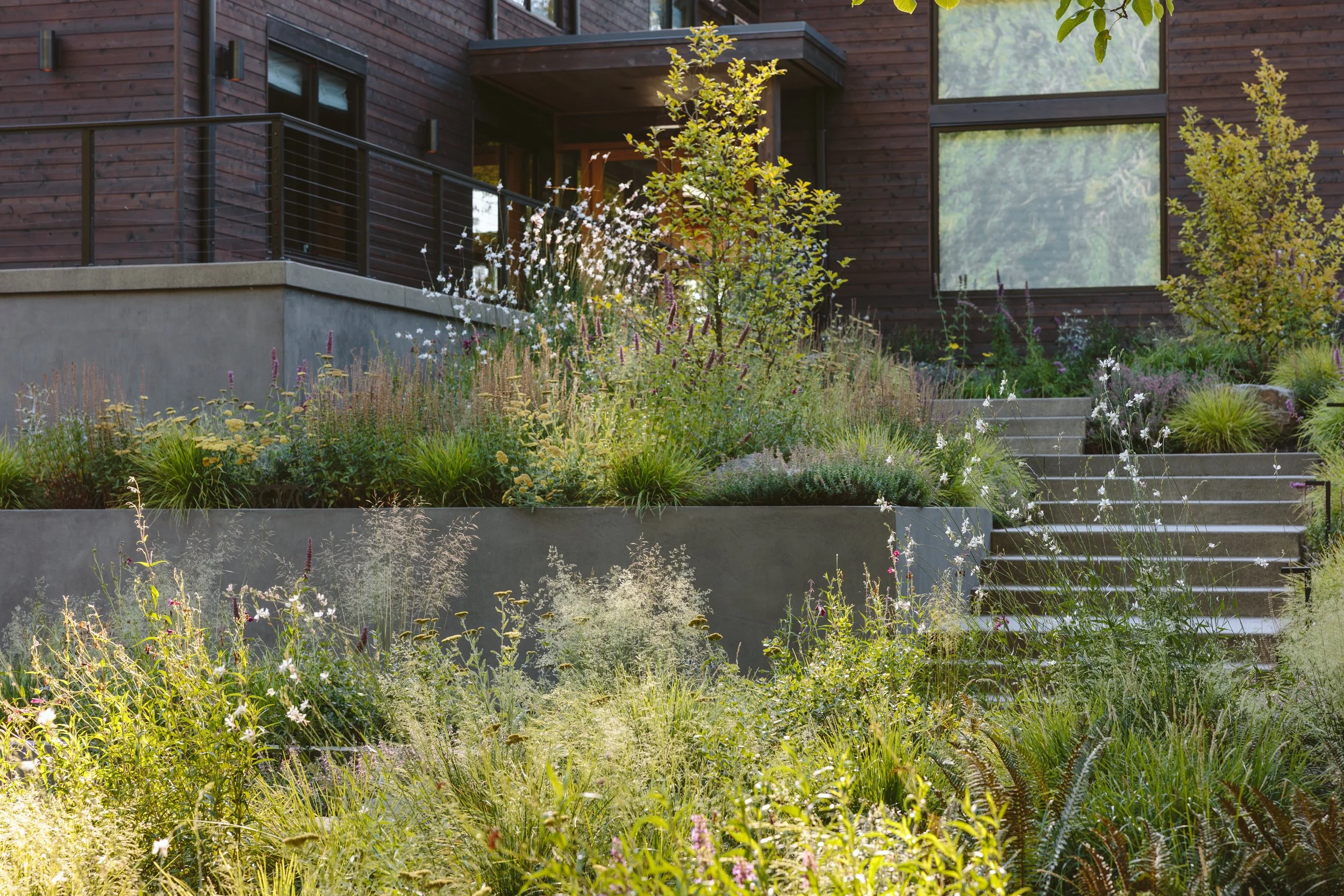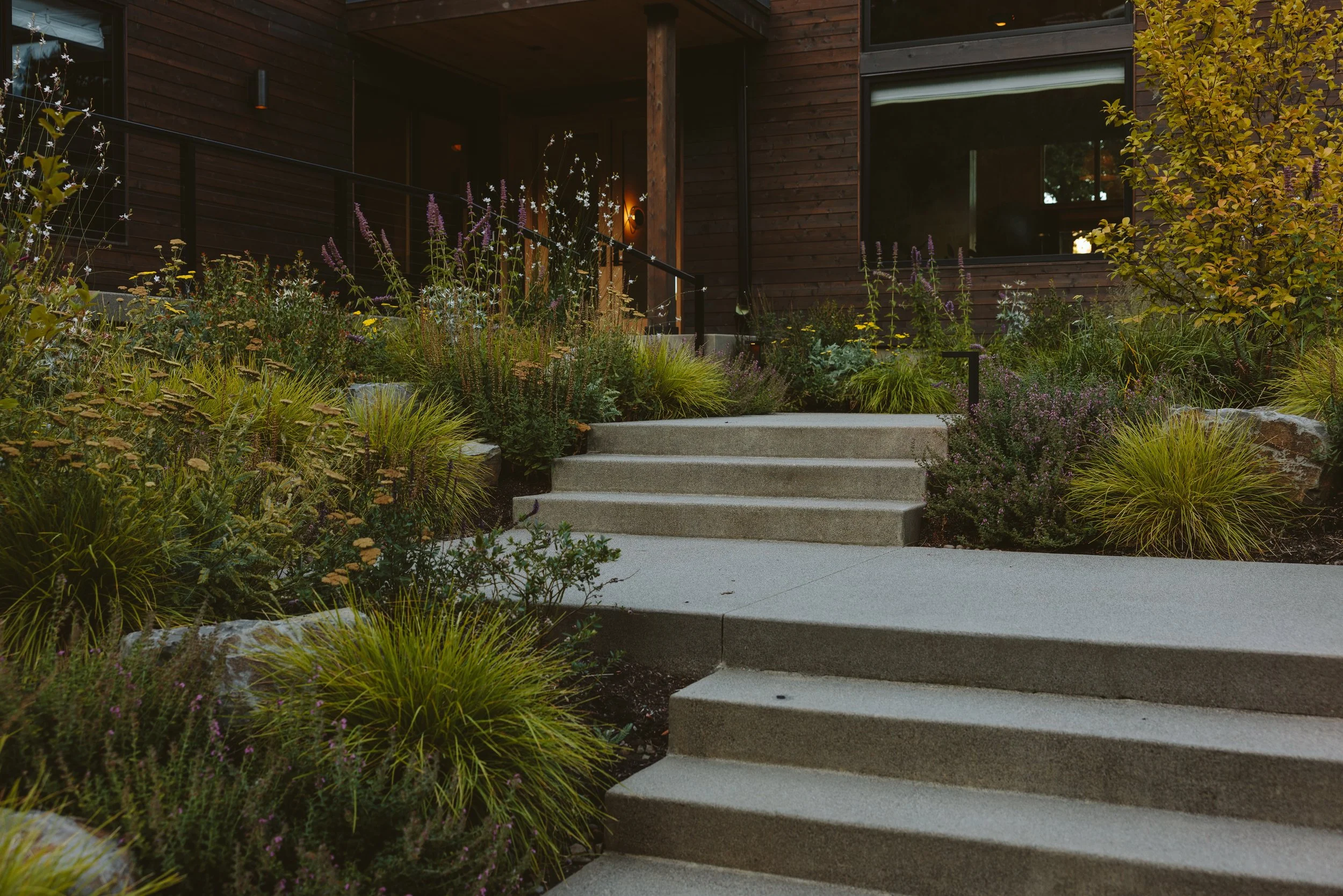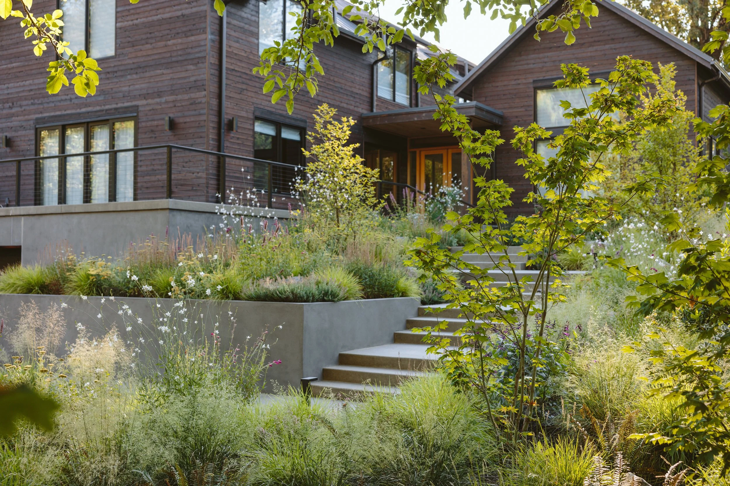 Leading up to the main entry of the house, a series of elegant, sand-finished concrete stairs and walls are flanked by a profusion of ornamental grasses and vibrant perennials, with a multi-colored array of blooms and textures that provide interest throughout the seasons, creating an exceptional experience on the way to the upper yard.