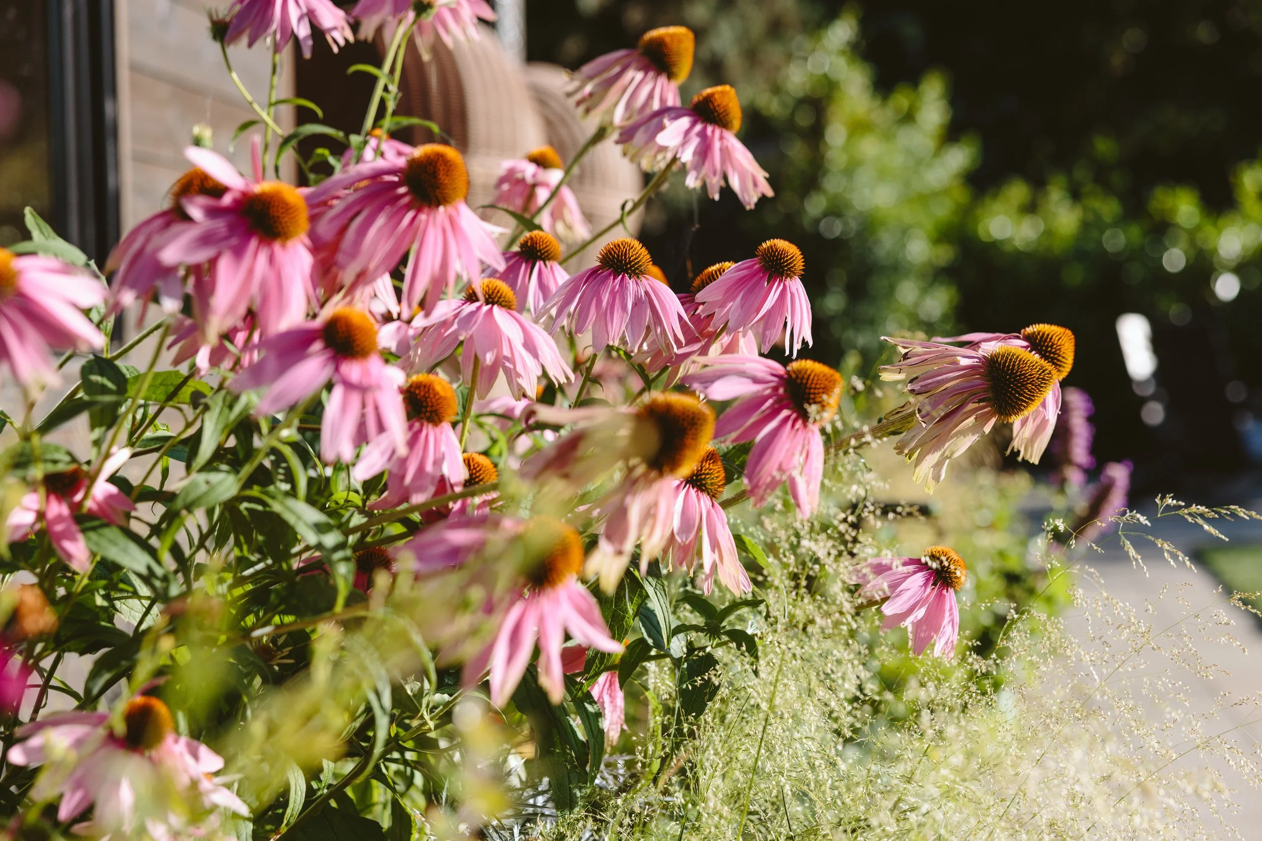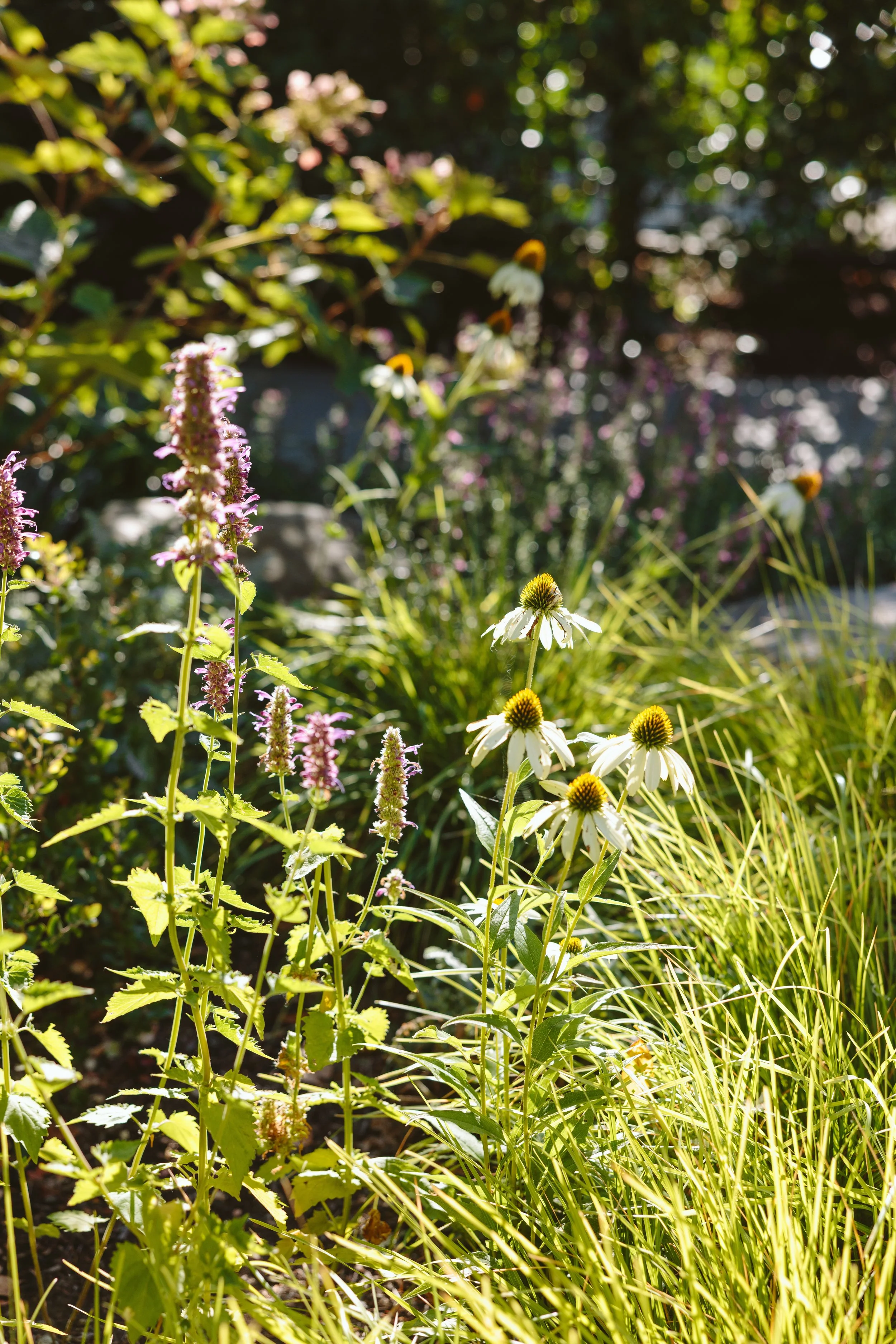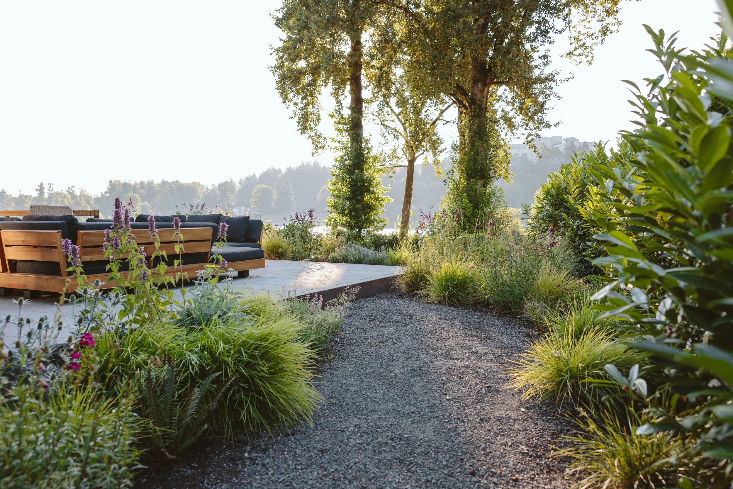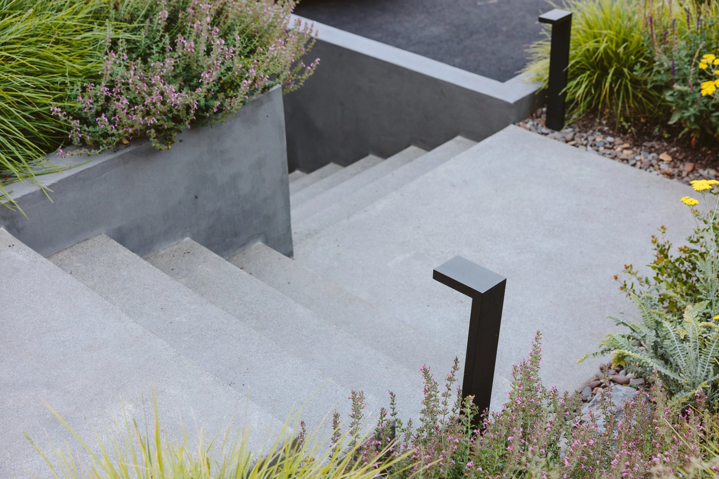 Leading up to the main entry of the house, a series of elegant, sand-finished concrete stairs and walls are flanked by a profusion of ornamental grasses and vibrant perennials, with a multi-colored array of blooms and textures that provide interest throughout the seasons, creating an exceptional experience on the way to the upper yard.