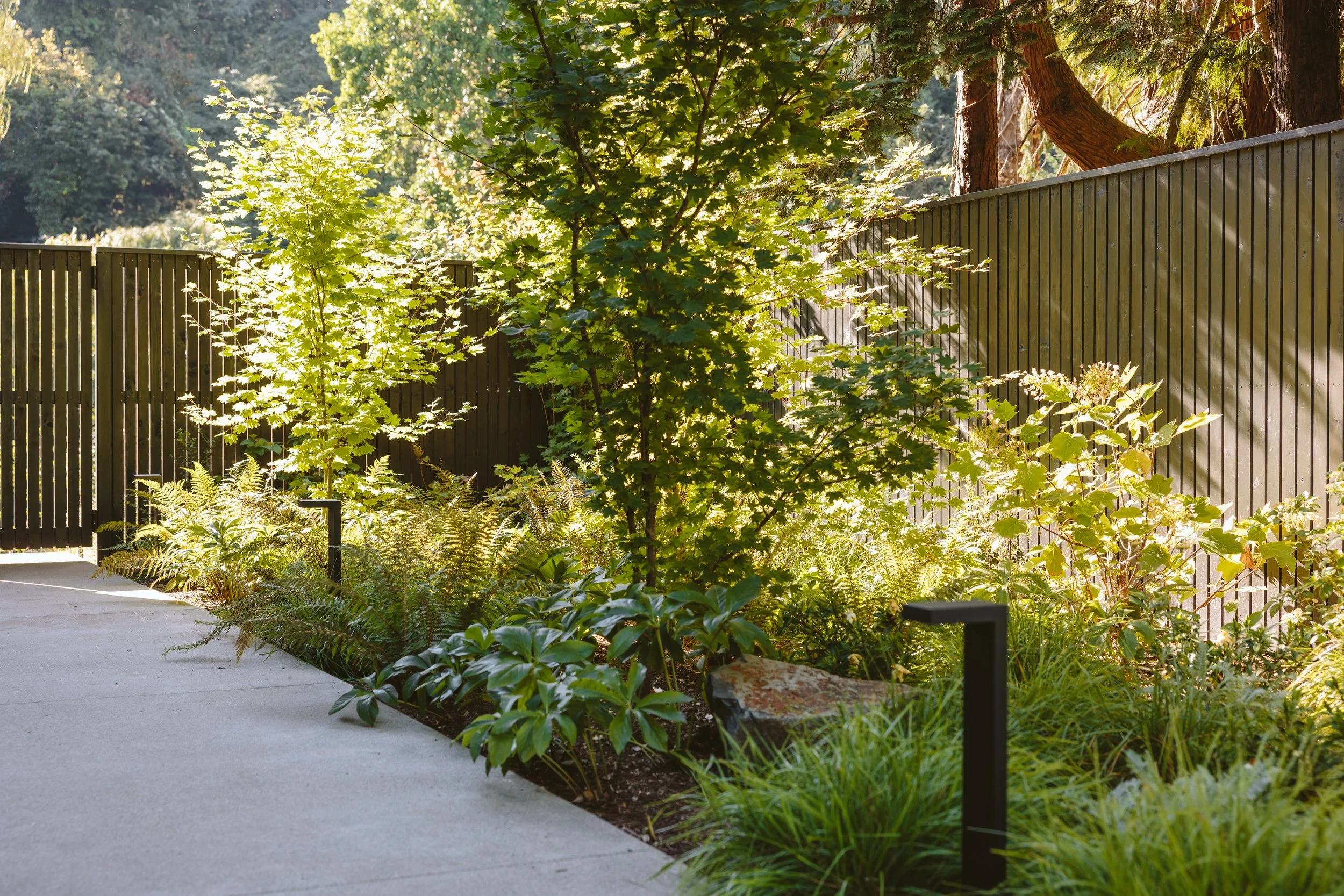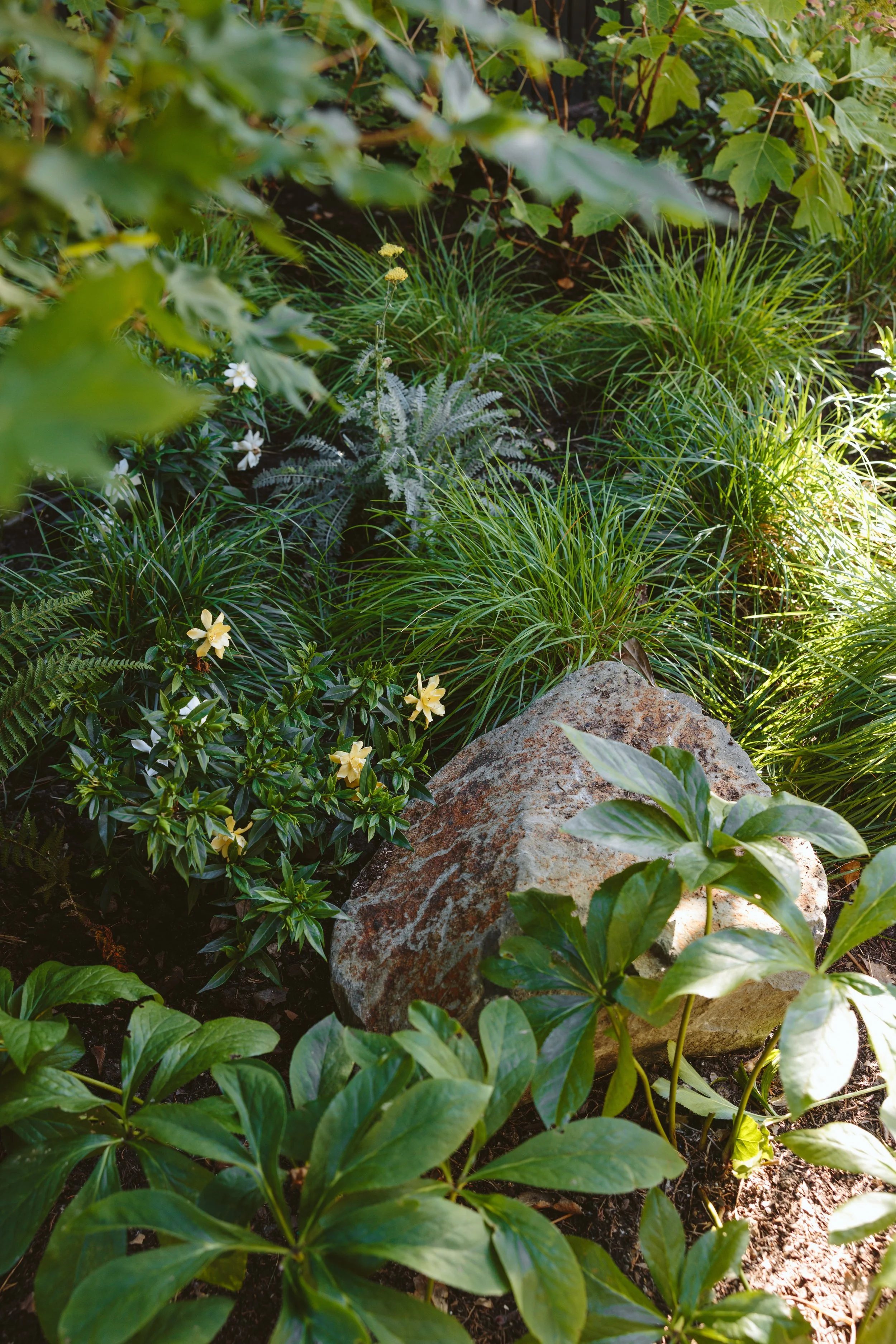 A re-imagined, large pond in the front yard landscape is highlighted by a naturalistic water feature, a massive Willow tree cascading over the east bank, a collection of tall River Birch trees with ample underplantings to buffer the road, and a variety of gathering spaces to enjoy the garden spaces, including a steel-edged fire pit area with views of the waterfall.